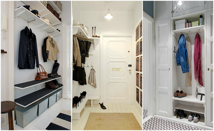 Когда прихожая небольшая, стоит выбирать модели со встроенными полками или вешалками.