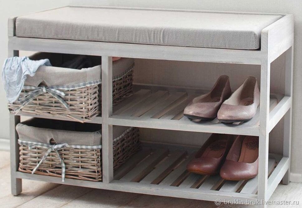 Объединив их с местом для сидения, в результате вы получите скамью-обувницу, которая станет идеальным вариантом в решении проблемы.
