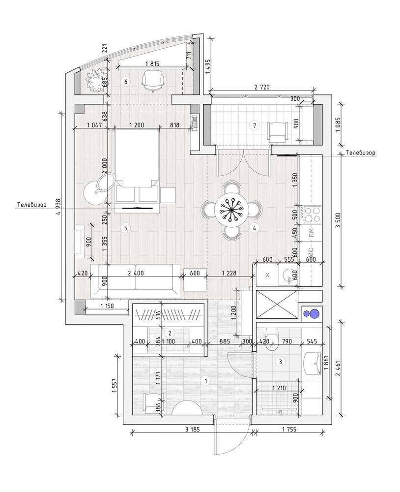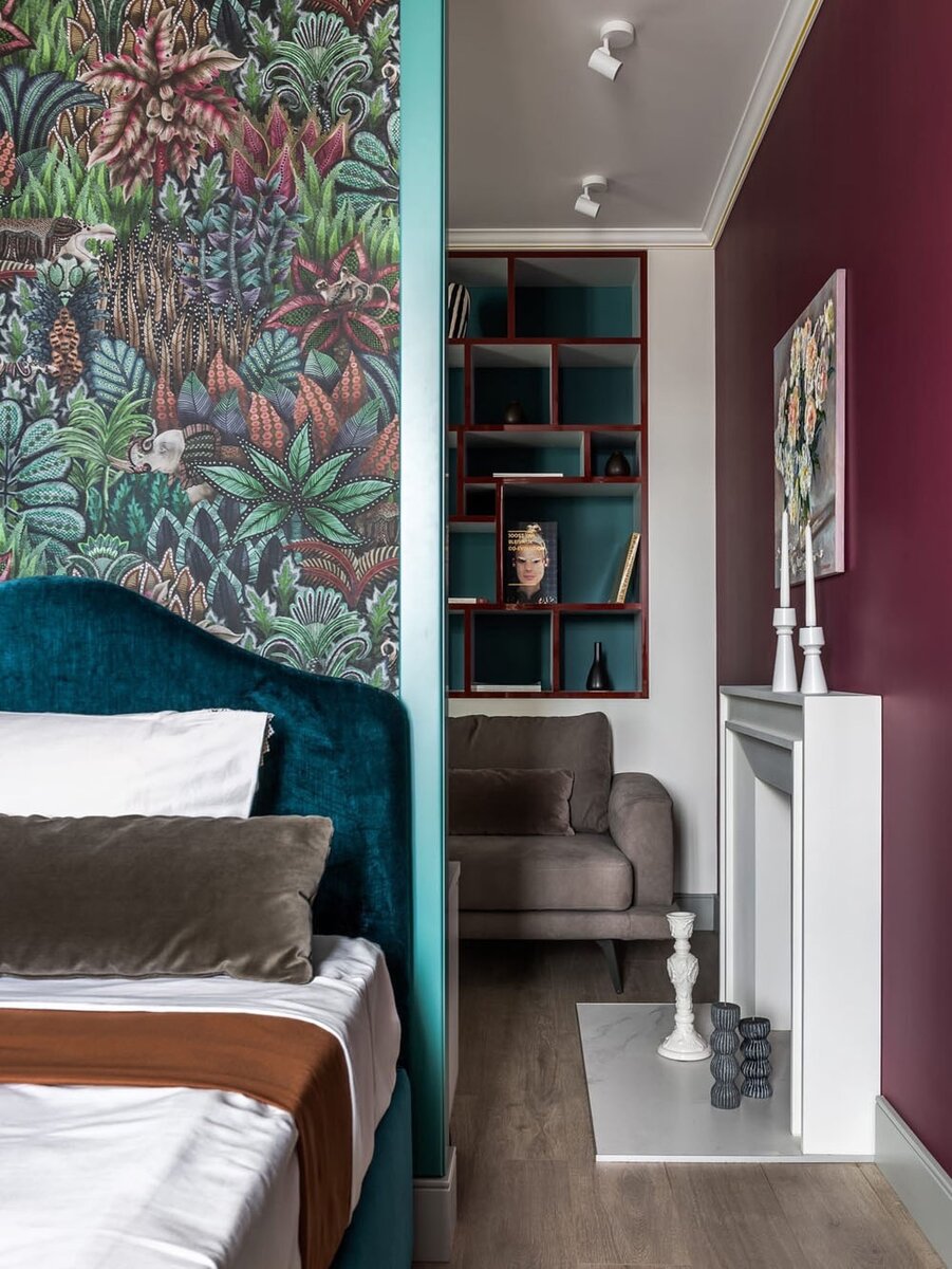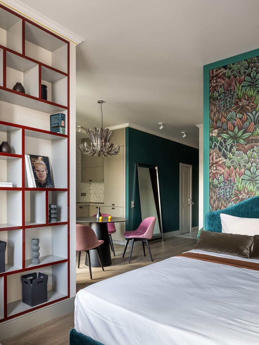 Спальную зону разместили у окна и отделили от зоны гостиной декоративной резной перегородкой. Площадь 43 кв.м. Локация — Самара.