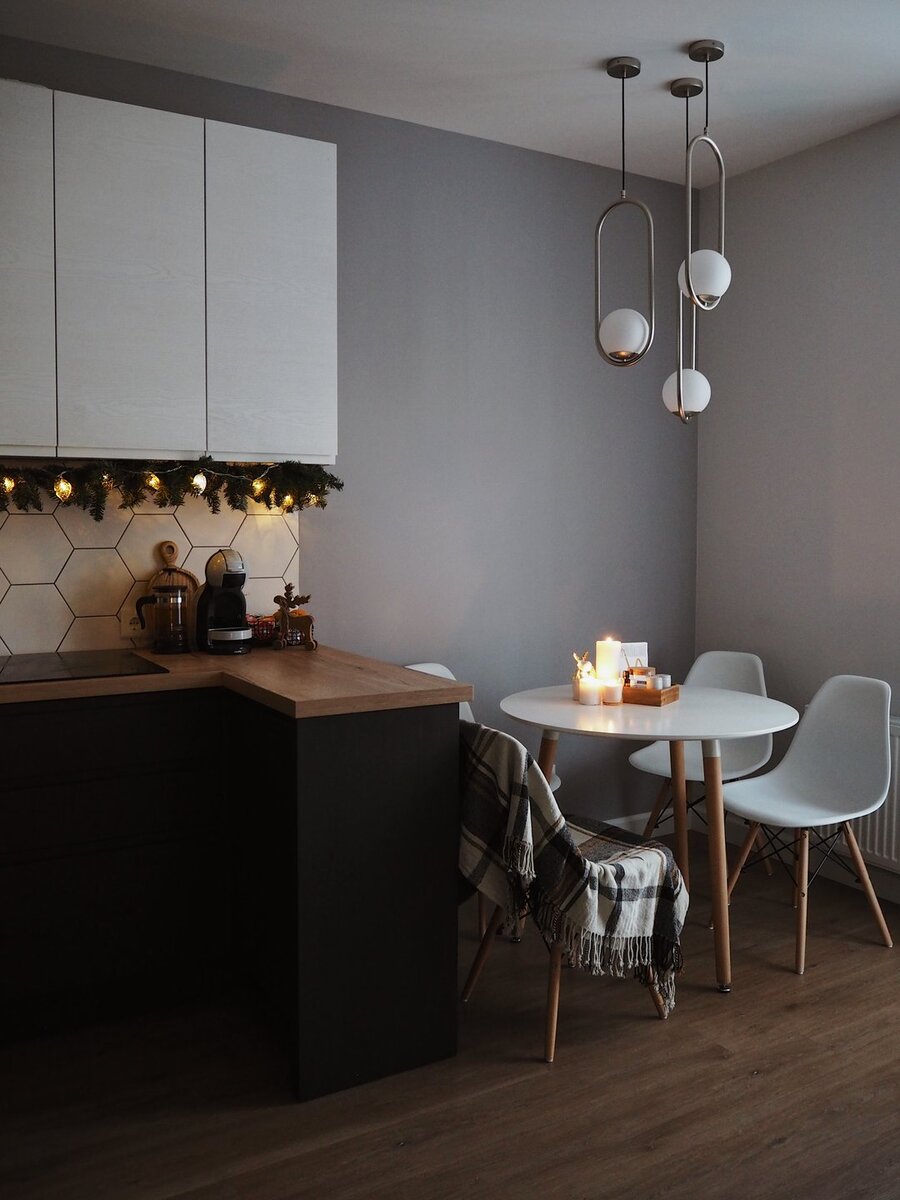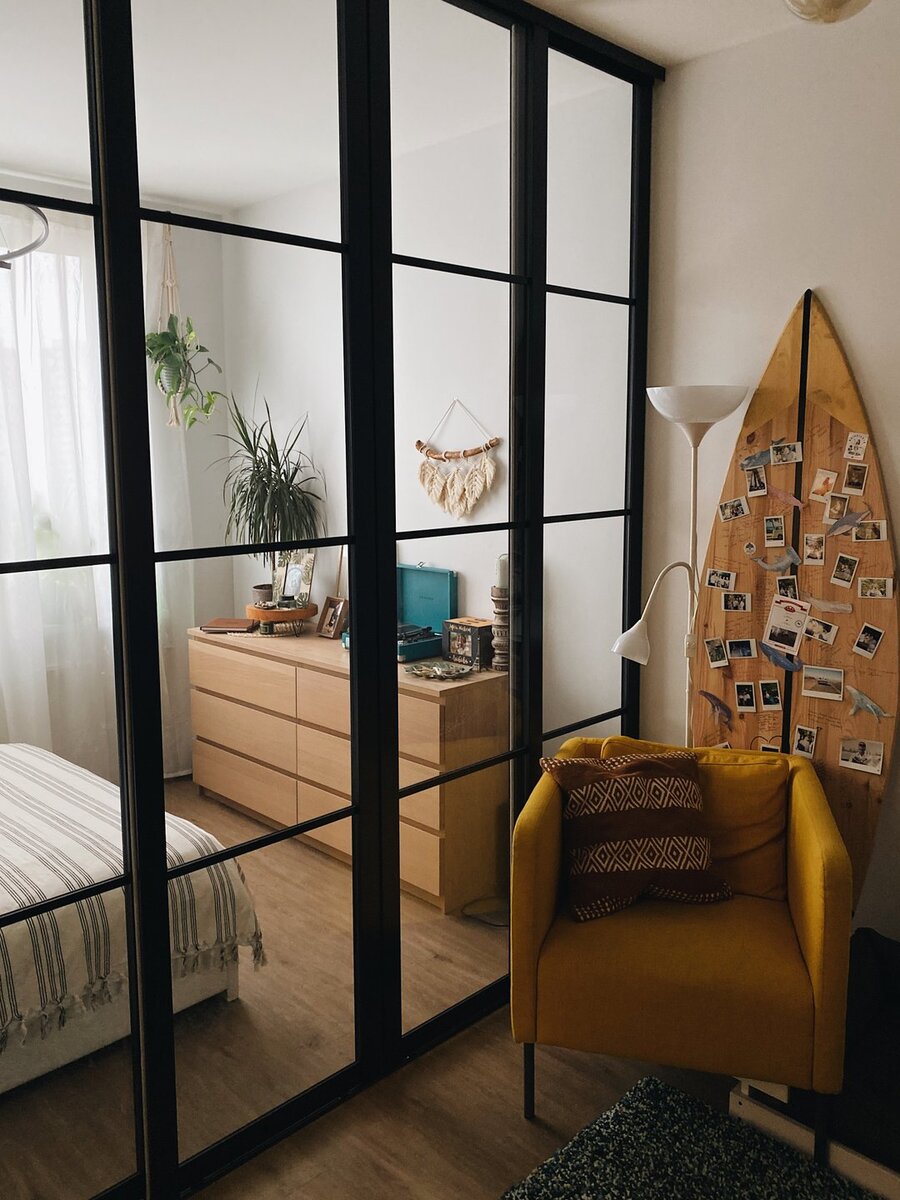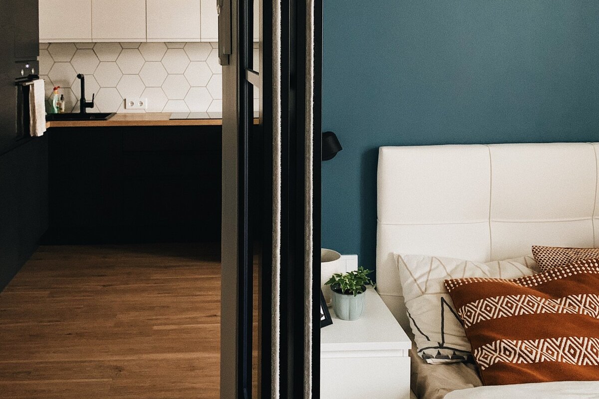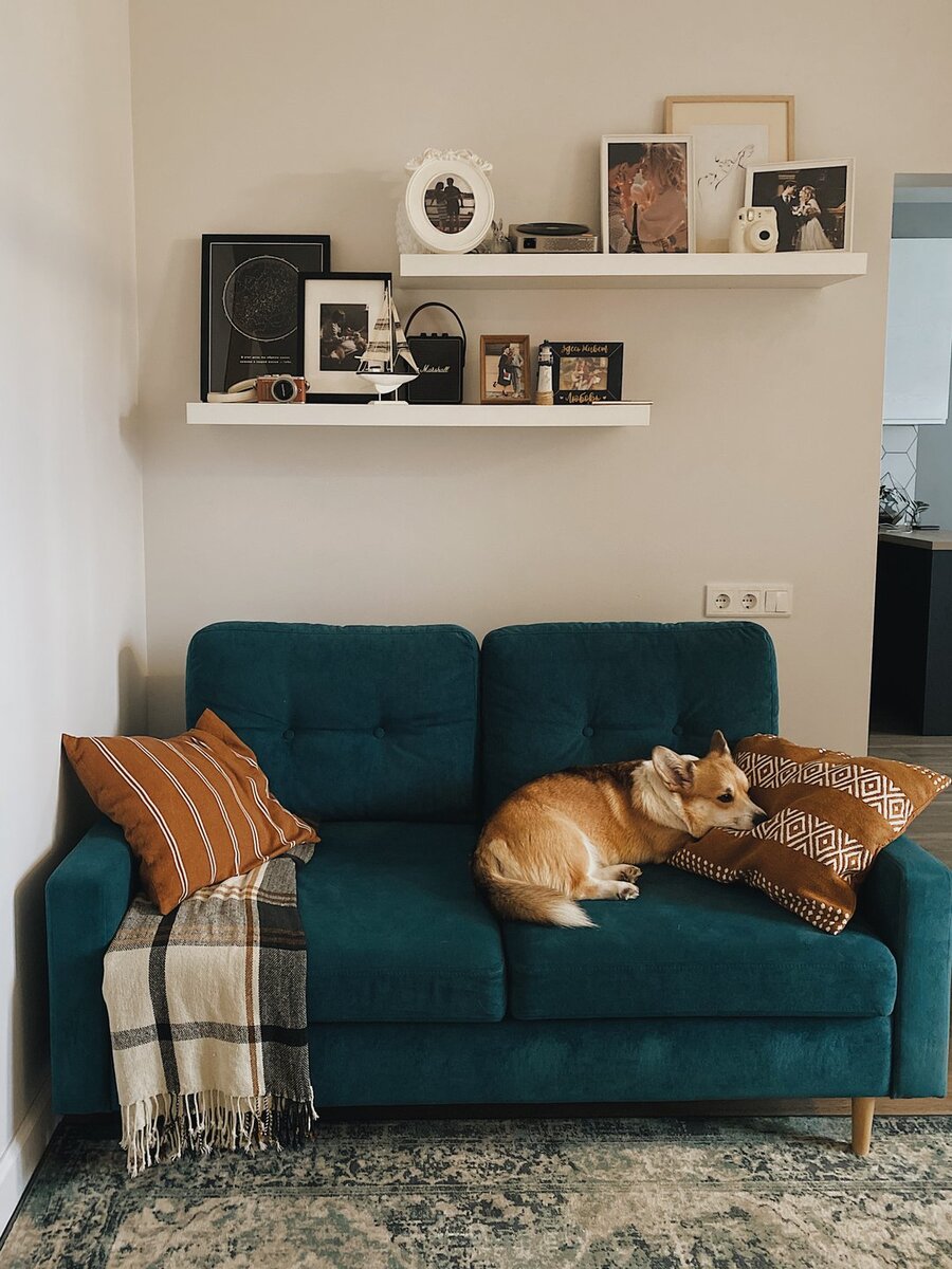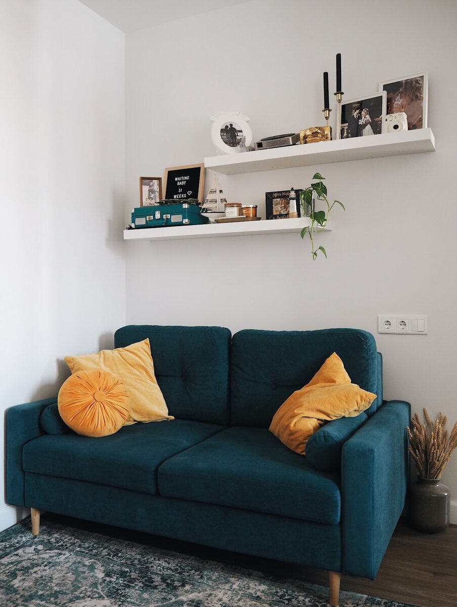 Молодая пара купила однушку, разделила комнату на две зоны (гостиная и спальня) и обставила квартиру мебелью, которая была куплена еще для старой квартиры.
