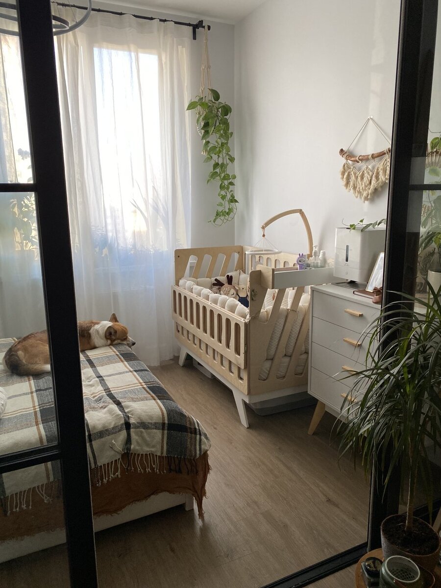 Когда появился ребенок, комод в спальной зоне заменили на детскую кроватку.