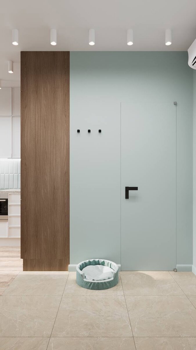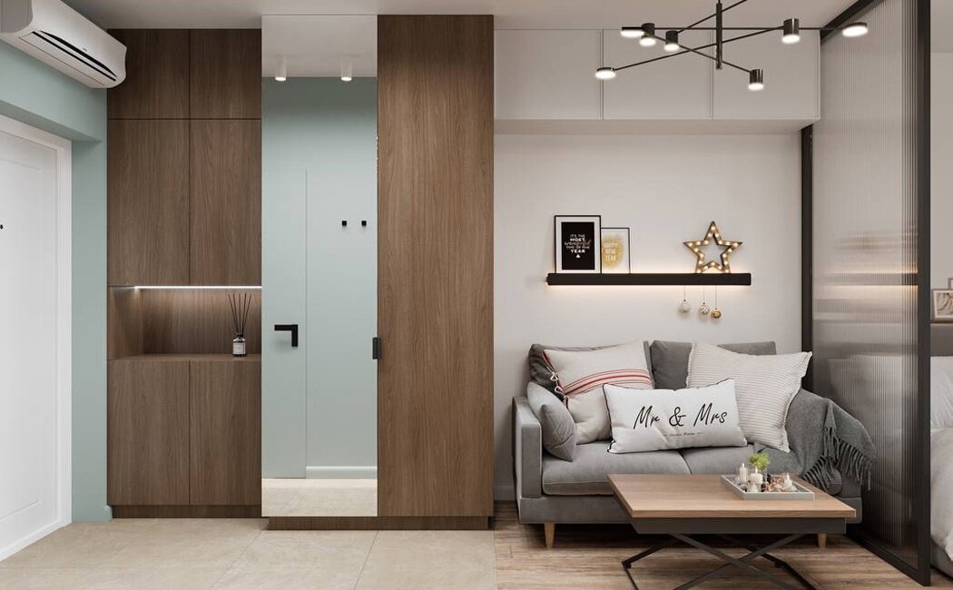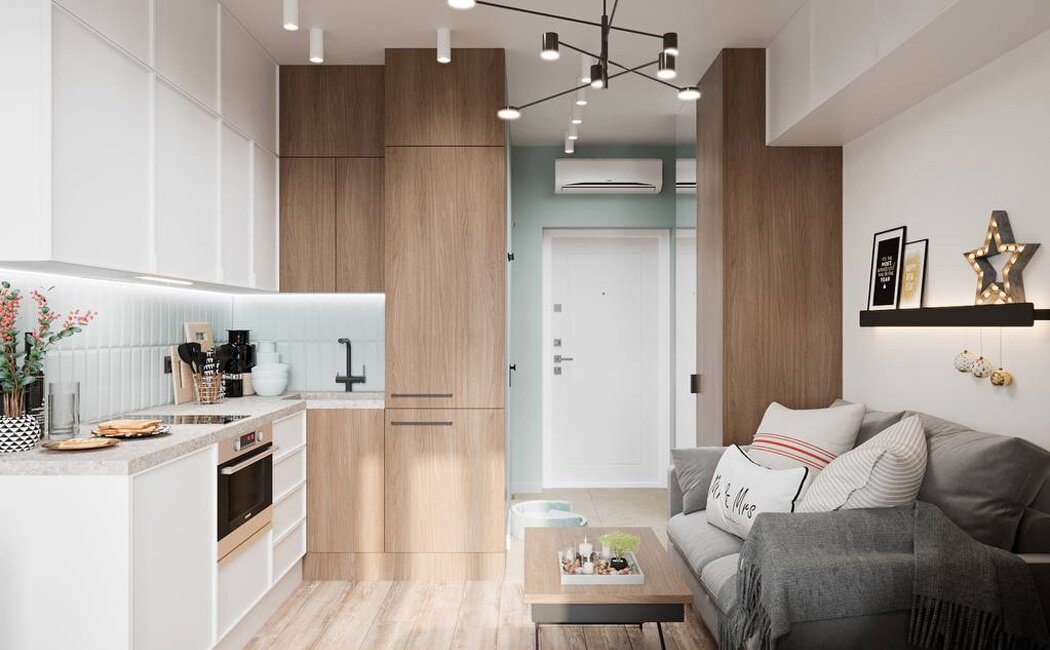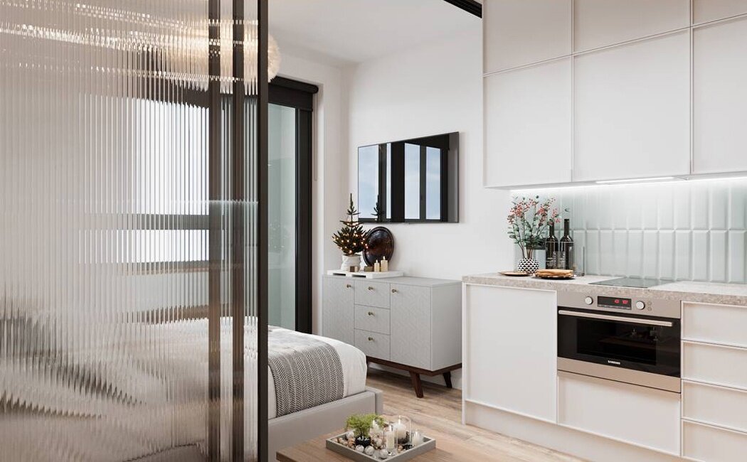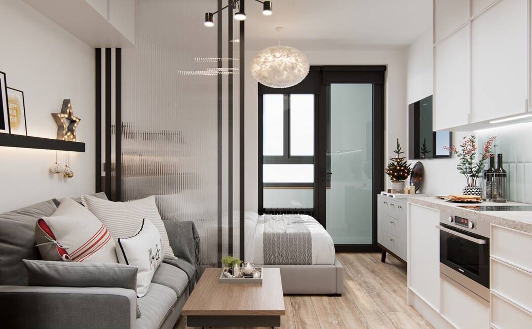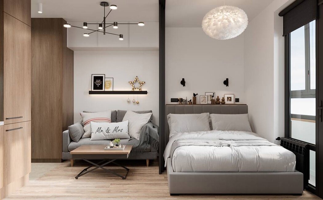 В вытянутой прямоугольной комнате площадью 15,8 кв.м. спальню и кухню-гостиную зонировали раздвижной стеклянной перегородкой.