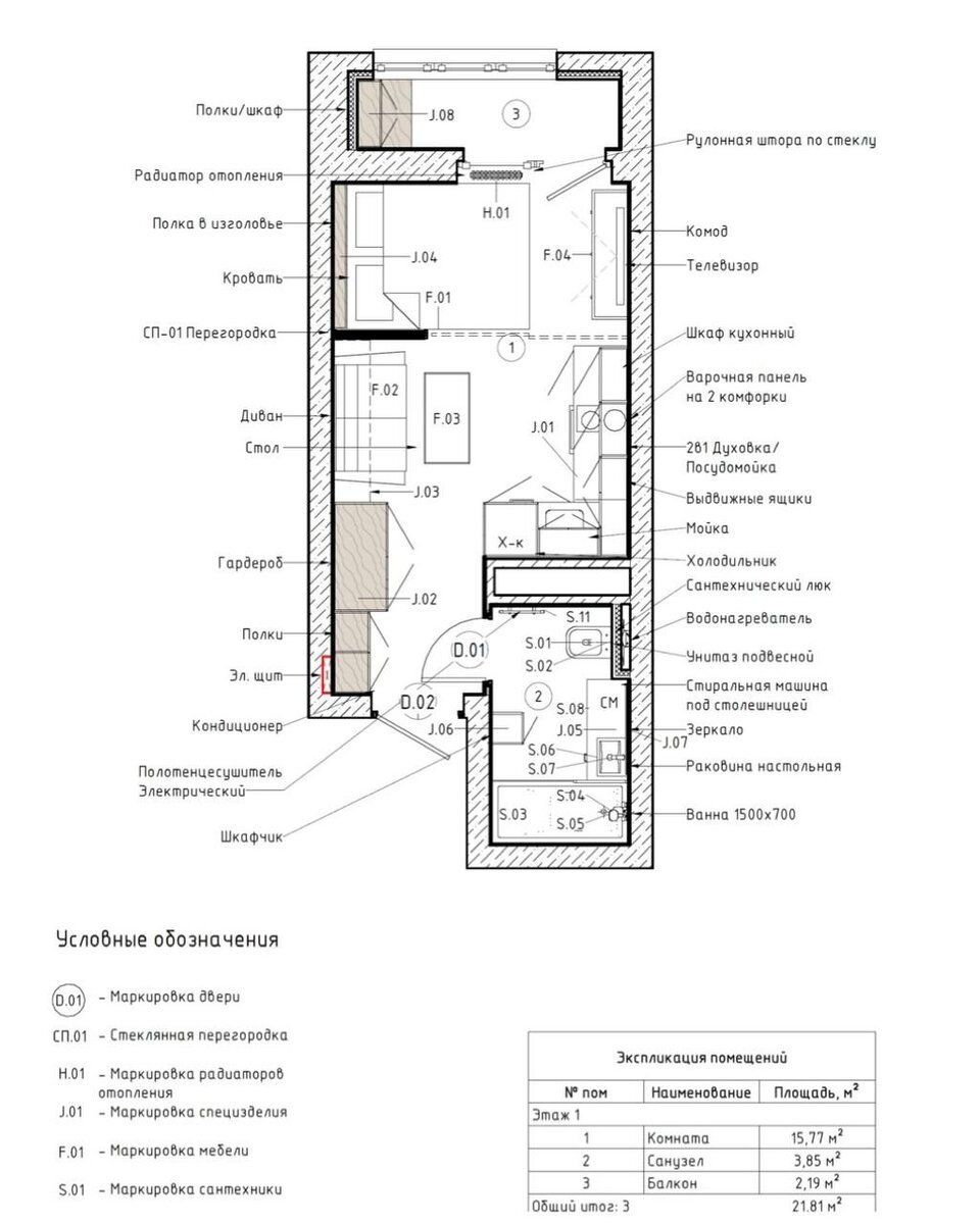 Площадь 19,6 кв.м (21,8 кв.м с лоджией).