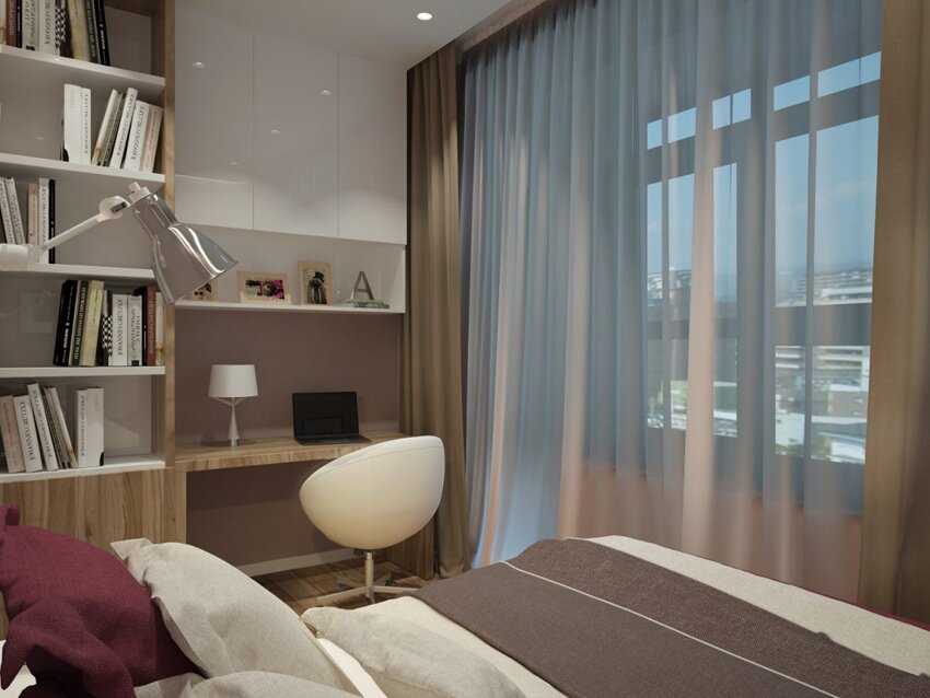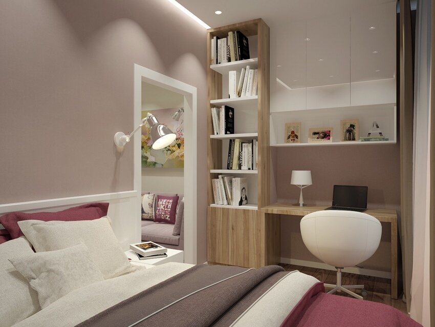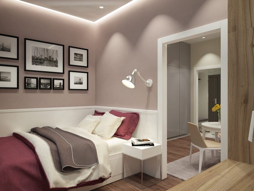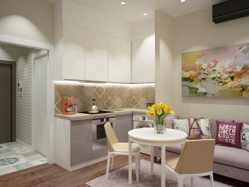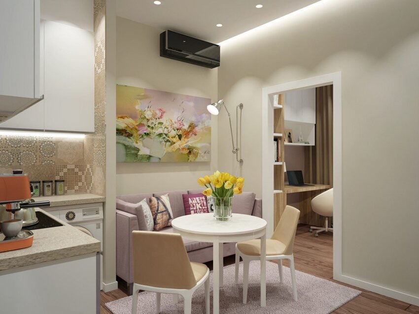 В студии оформили проходную кухню-гостиную с милым диванчиком, а у окна — изолированную спальню.