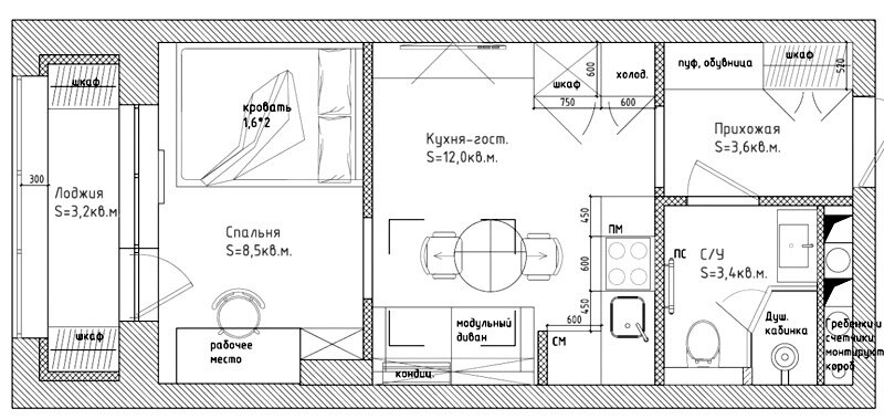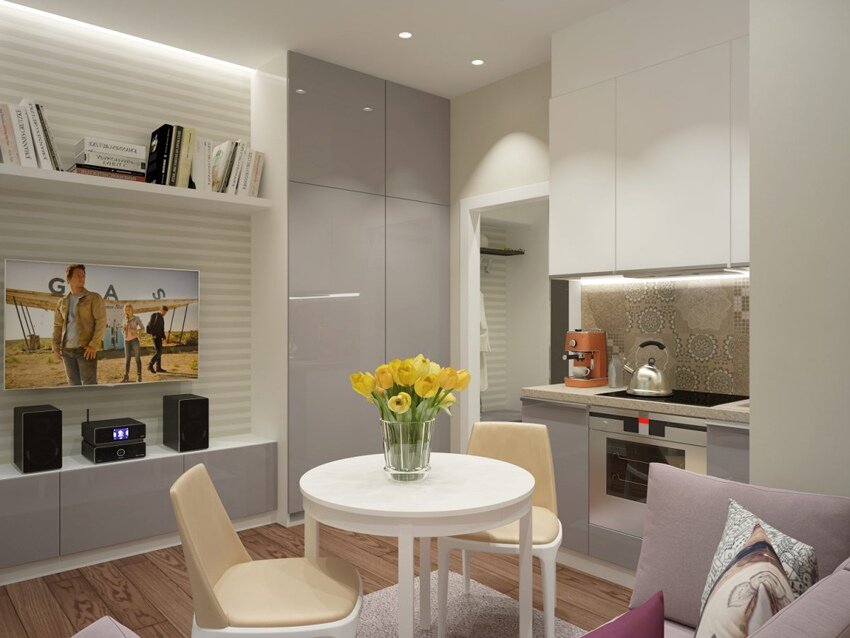 Интересные идеи в проекте студии площадью 27,5 кв.м. (с лоджией – 30,7 кв.м.).