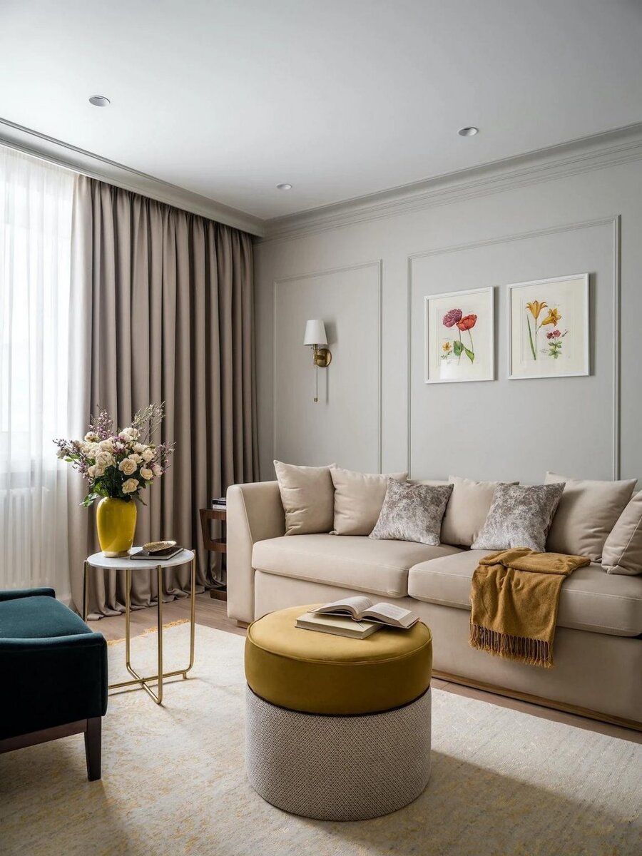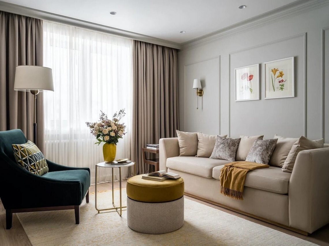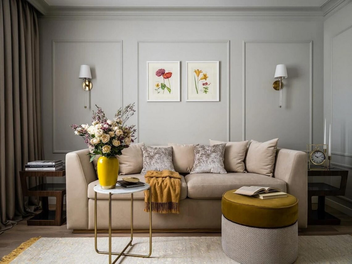 Что касается отделки, то стены покрашены и украшены лепниной, что придало гостиной более торжественную атмосферу и классический вид.