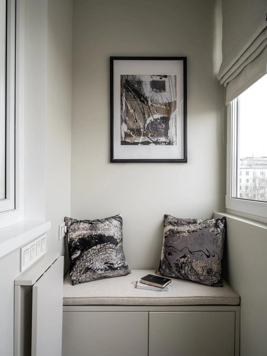 На лоджии организован уголок для чтения с диванчиком, а благодаря и откидному столику здесь можно работать.