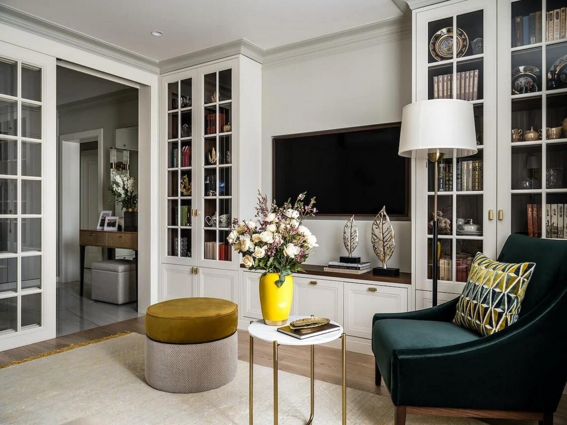 В гостиной напротив дивана установили стеклянные шкафы — сюда поместили книги хозяйки коллекцию керамики и другие мелочи. Также внизу есть закрытые шкафчики для вещей.