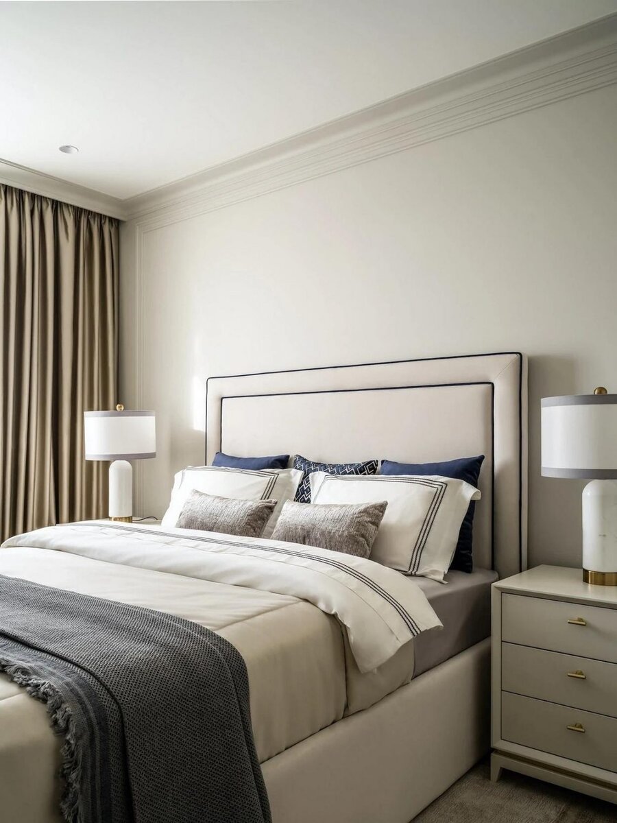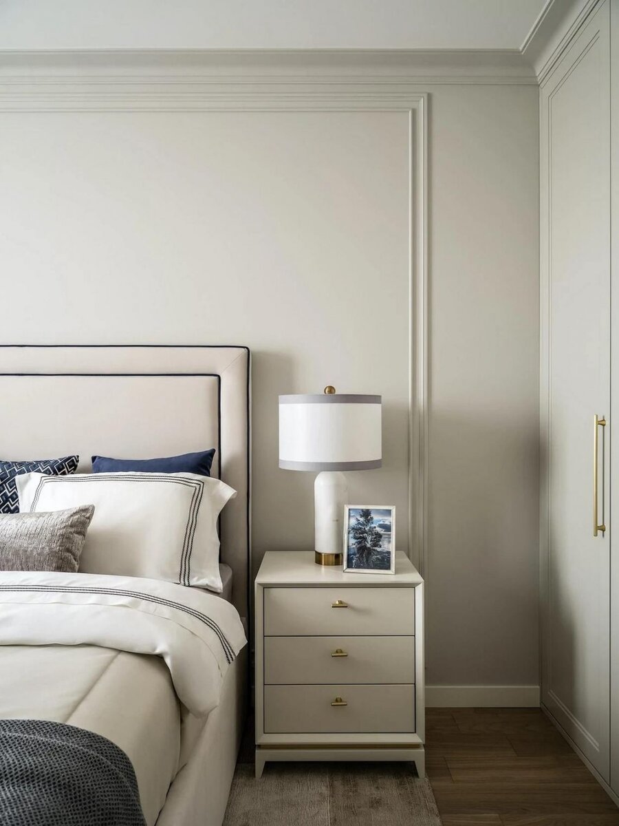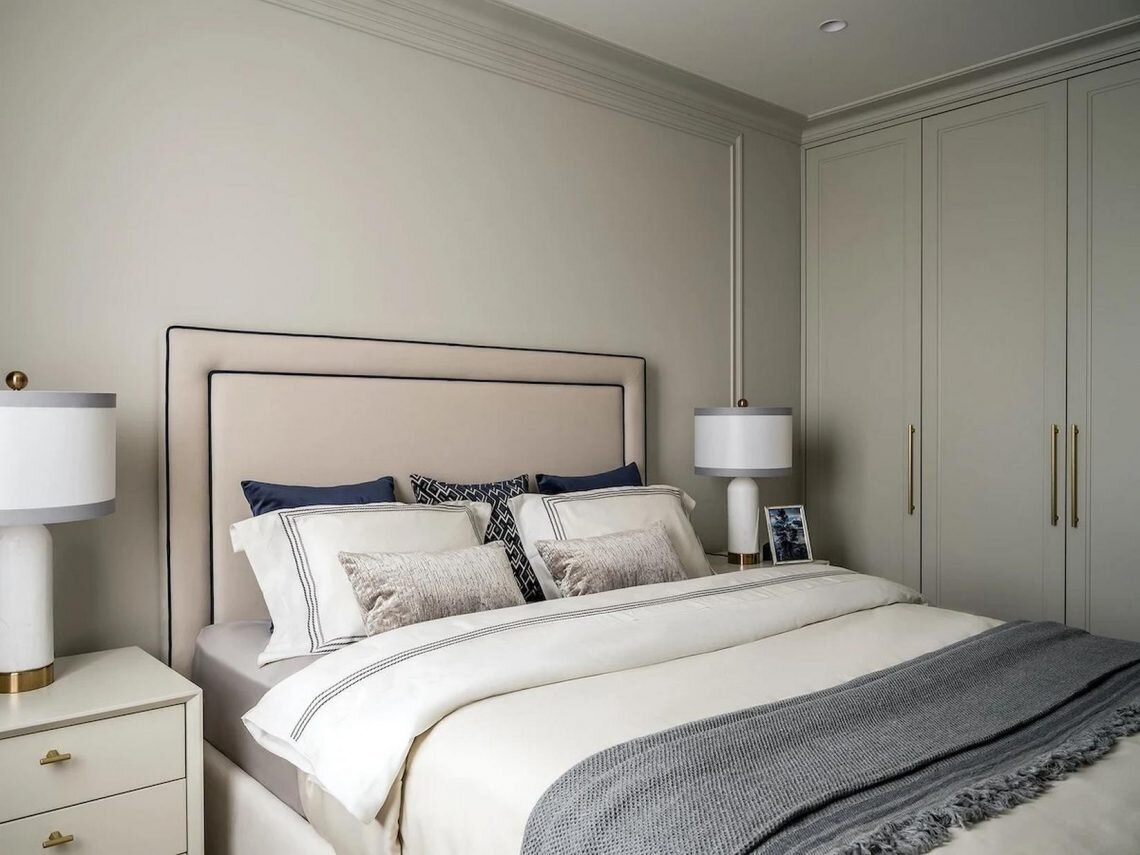 Цветовая палитра спальни основана на серых и жемчужных оттенках. Стены выкрашены в более холодный цвет, дающий комнате больше воздуха.