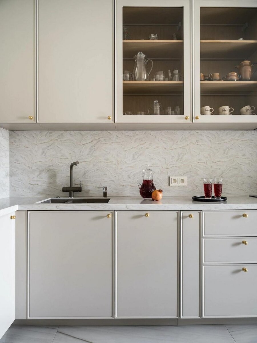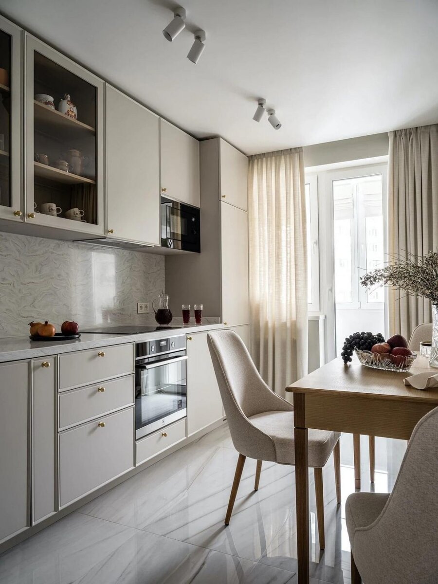 На кухне — вместительный кухонный гарнитур с необходимой техникой. Часть верхних шкафов также сделана со стеклянными фасадами, чтобы на них можно было выставить красивую посуду.