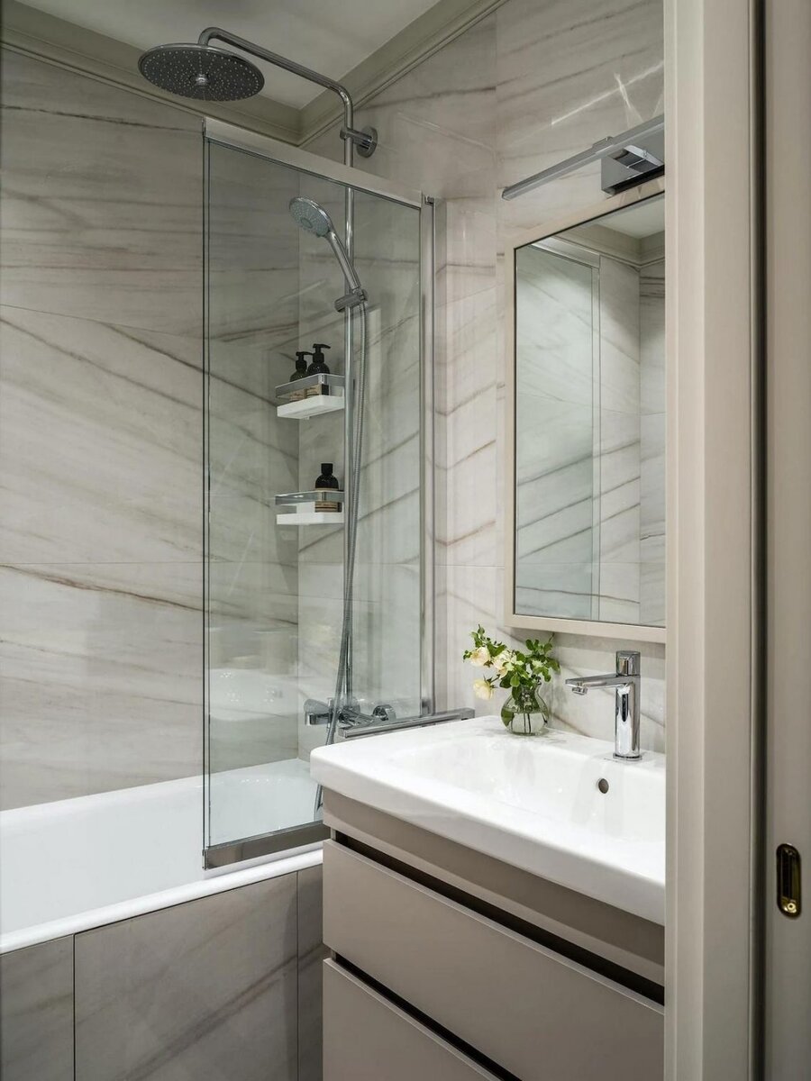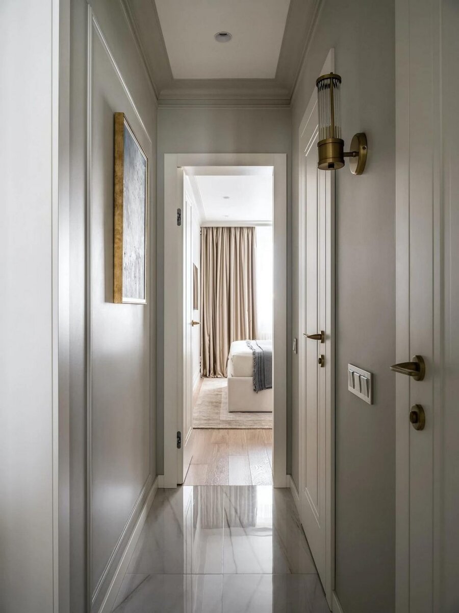 Правда, удалось немного видоизменить одну ненесущую стену — расширили вход в гостиную из прихожей. В получившийся больший проем установили высокую раздвижную перегородку из стекла. Это не только сделало интерьер более эффектным, но и темный холл сразу стал светлее и уютнее.