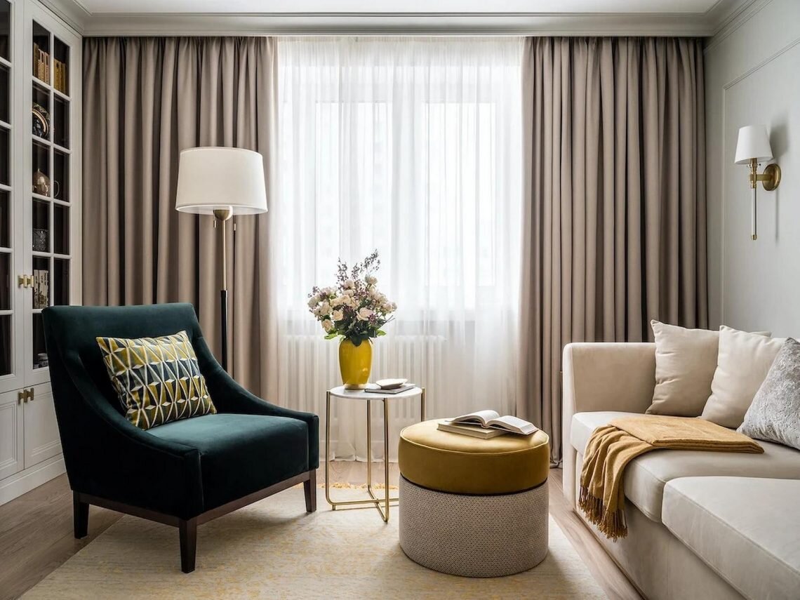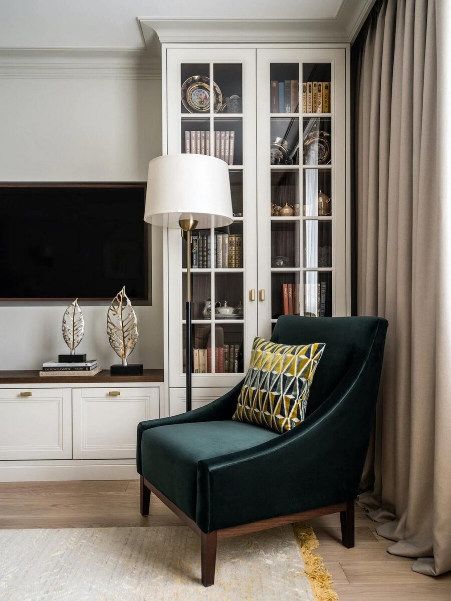 Дополнительные цвета также естественны, например, благородный зеленый цвет кресла и песочный цвет тахты.