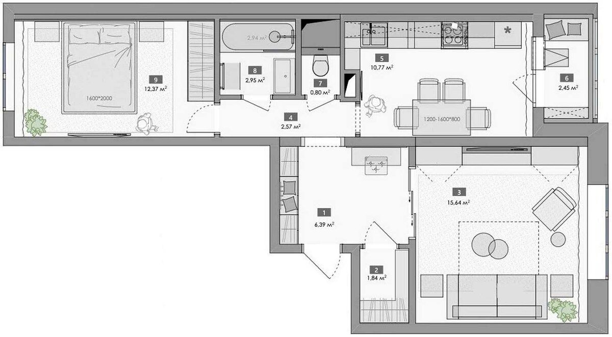 Площади более чем достаточно для одной хозяйки, поэтому о перепланировке даже не думали. Впрочем, бетонные несущие стены все равно не позволили бы это сделать.