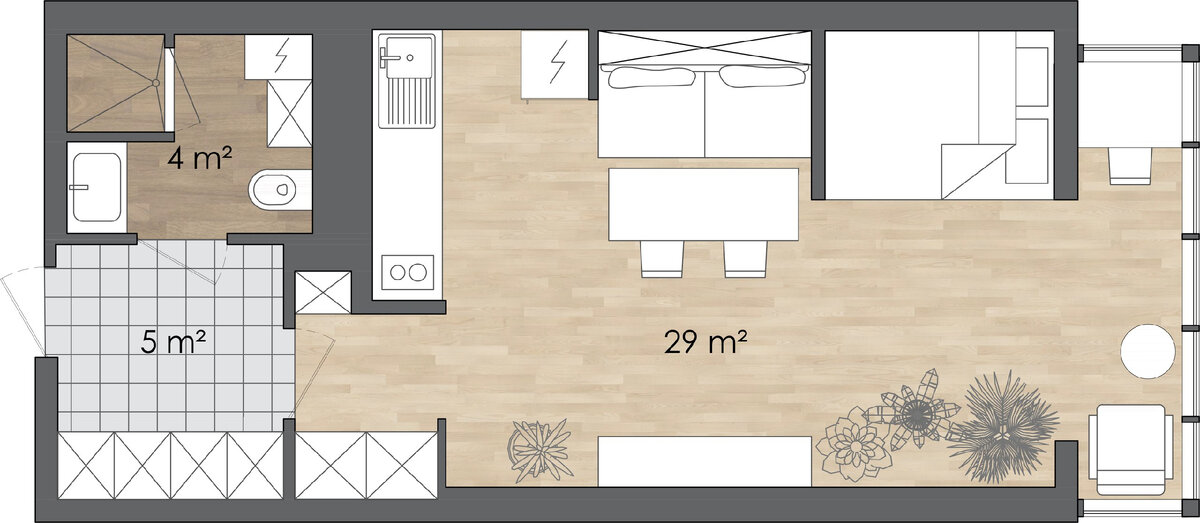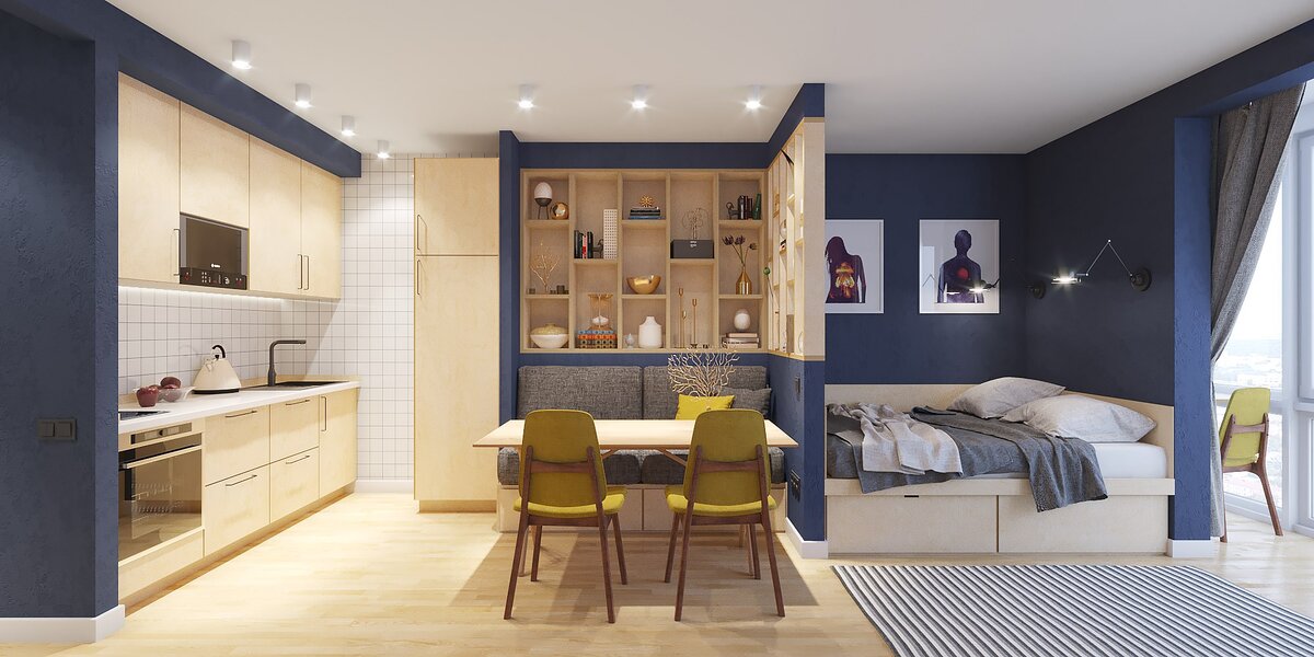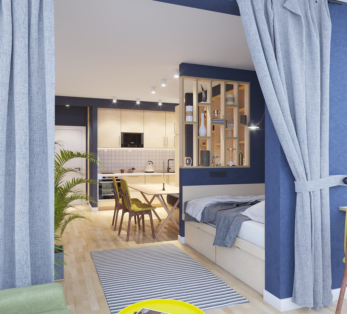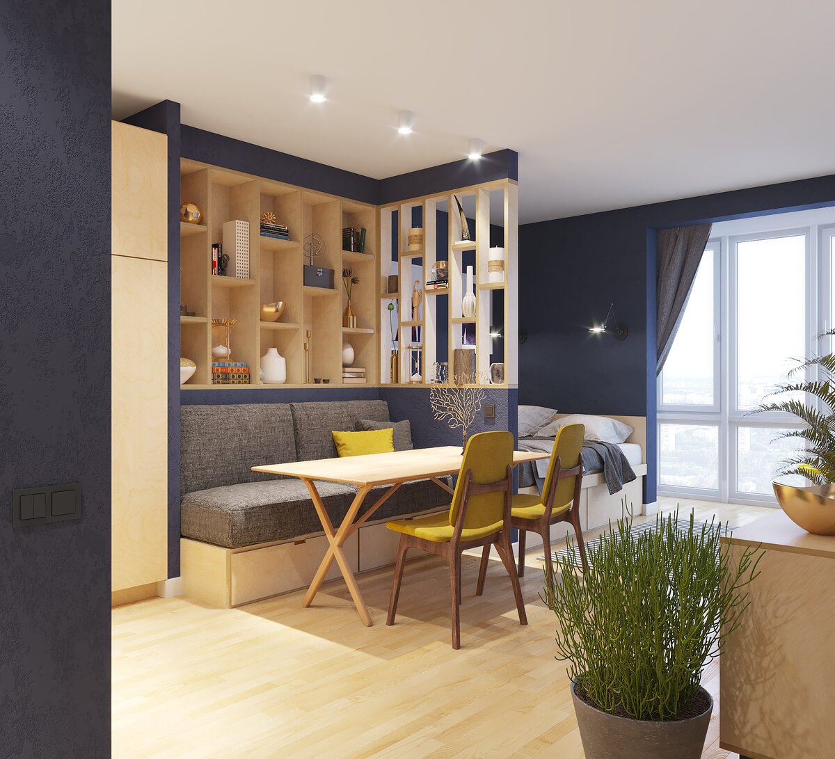 Он хотел иметь хорошо организованное, комфортное пространство, где нашлось бы место для полноценной кухни, удобной спальни, рабочей зоны и достаточного количества мест для хранения.
