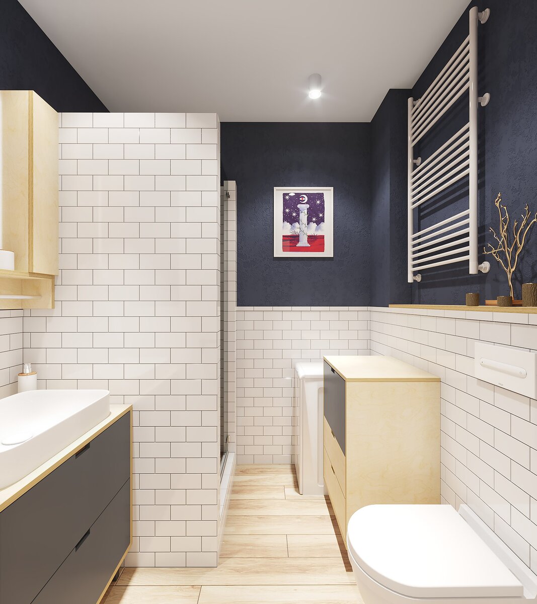 В ванной комнате влажная и сухая зоны разделены, также здесь нашлось место для стиральной машины.