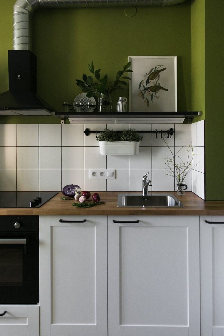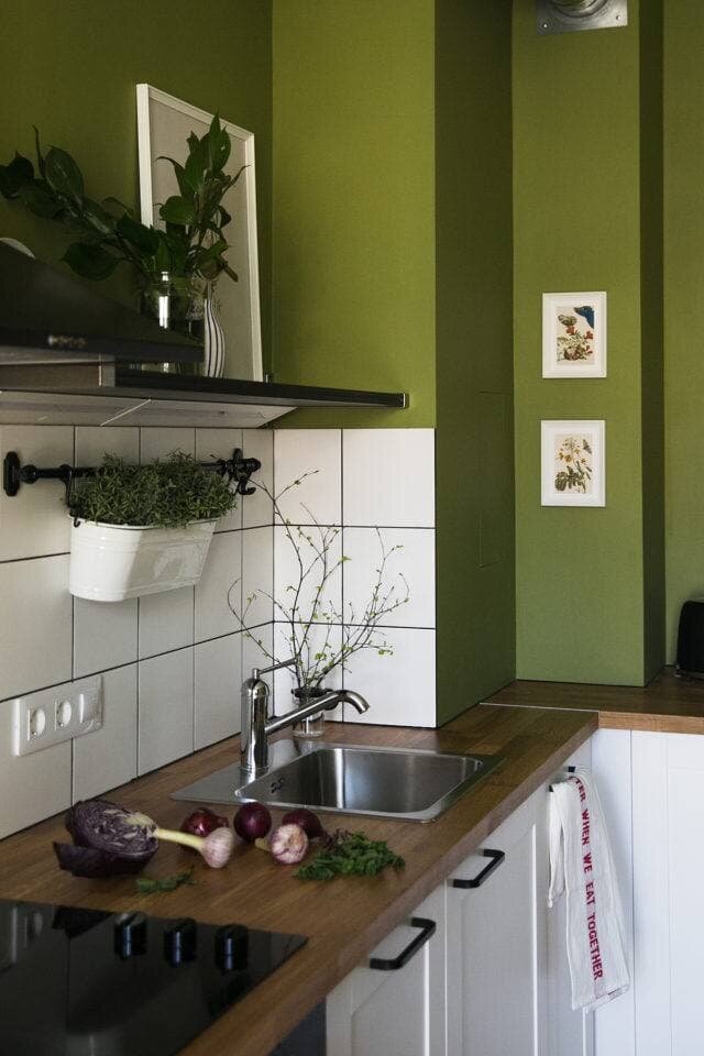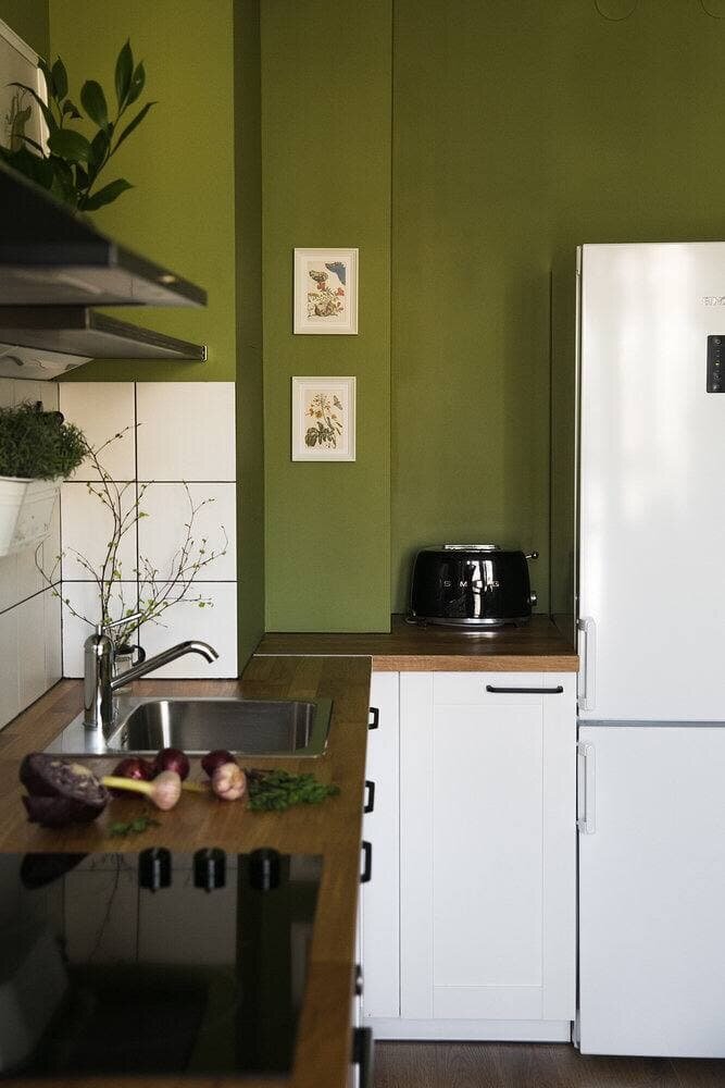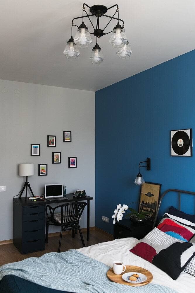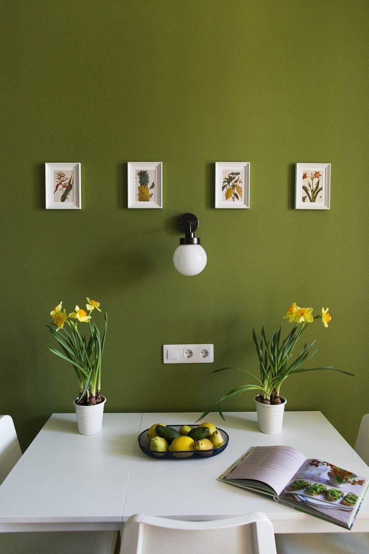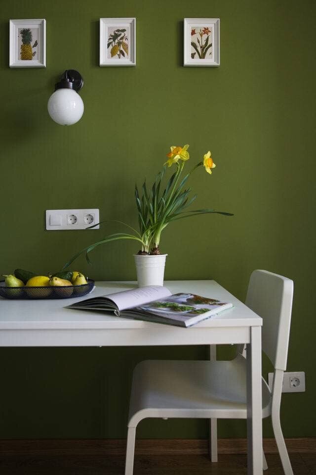 Оливковый хорошо гармонирует с деревом и различными тонами белого в кухне, а голубая акцентная стена в спальне придает ей стиля и характера.