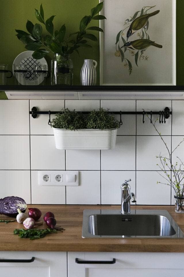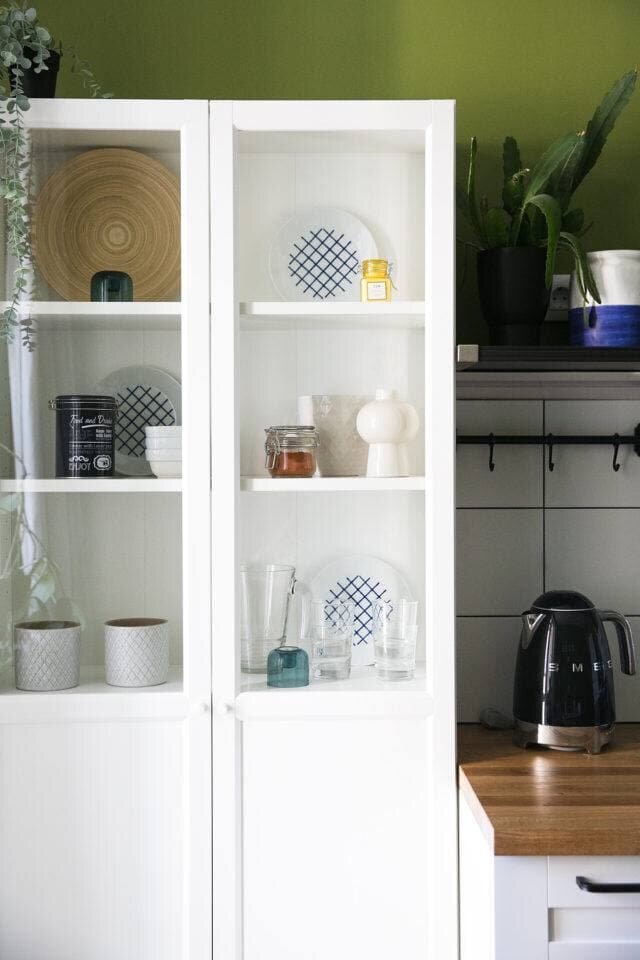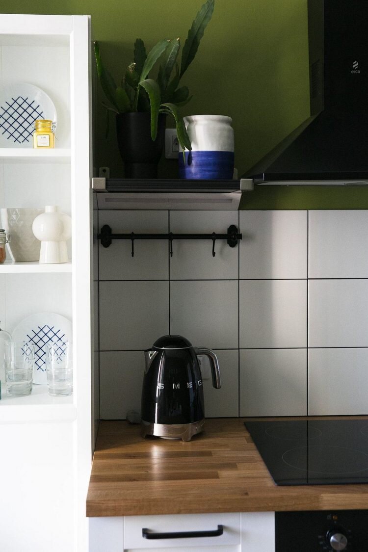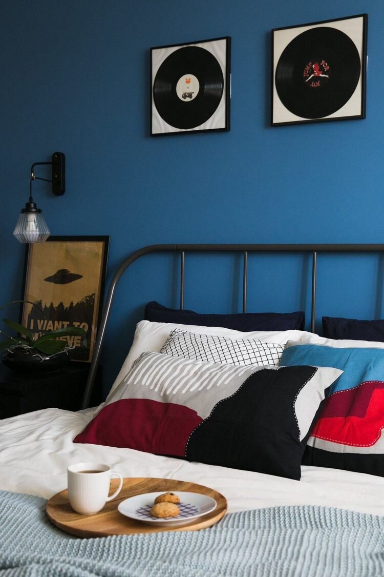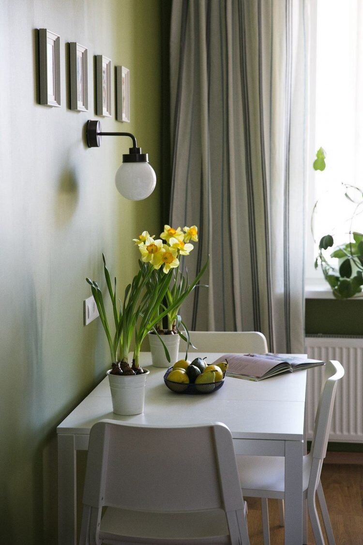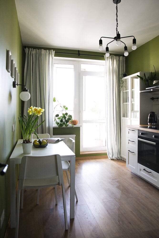 Оливковый хорошо гармонирует с деревом и различными тонами белого в кухне, а голубая акцентная стена в спальне придает ей стиля и характера.