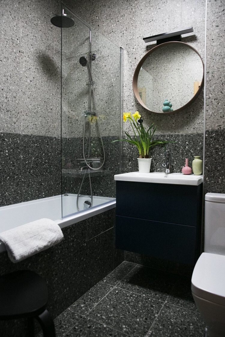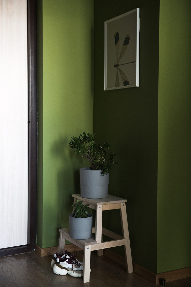 Насыщенные, но не «кричащие» оттенки оливкового и голубого цветов делают эту квартиру очень выразительной.