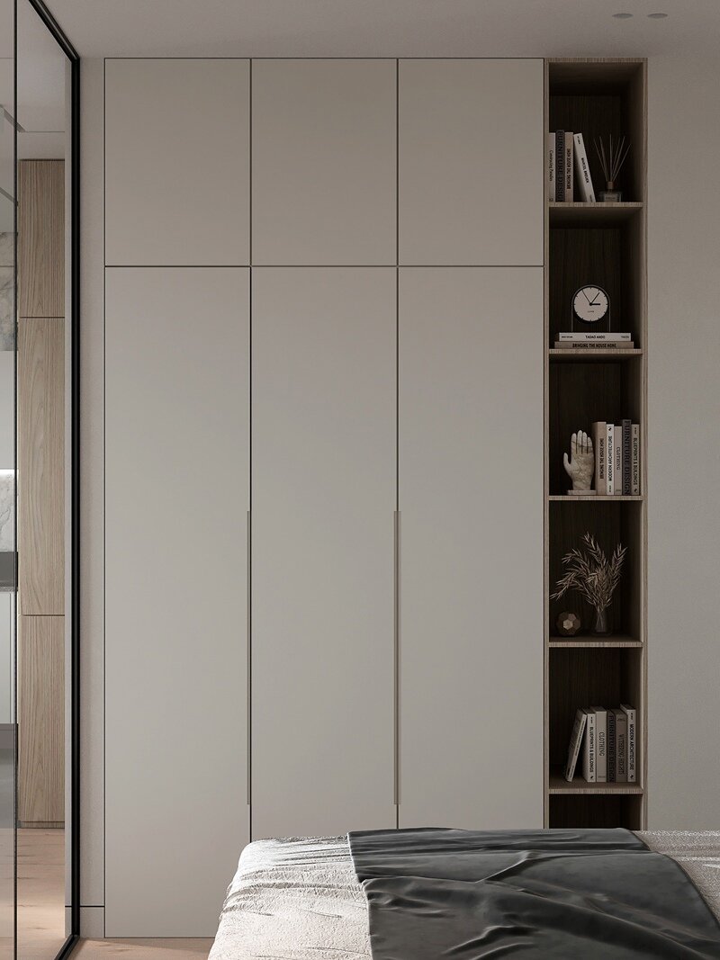 После перепланировки в квартире просторная кухня — гостиная и спальня, отделенная шкафом и стеклянной перегородкой.