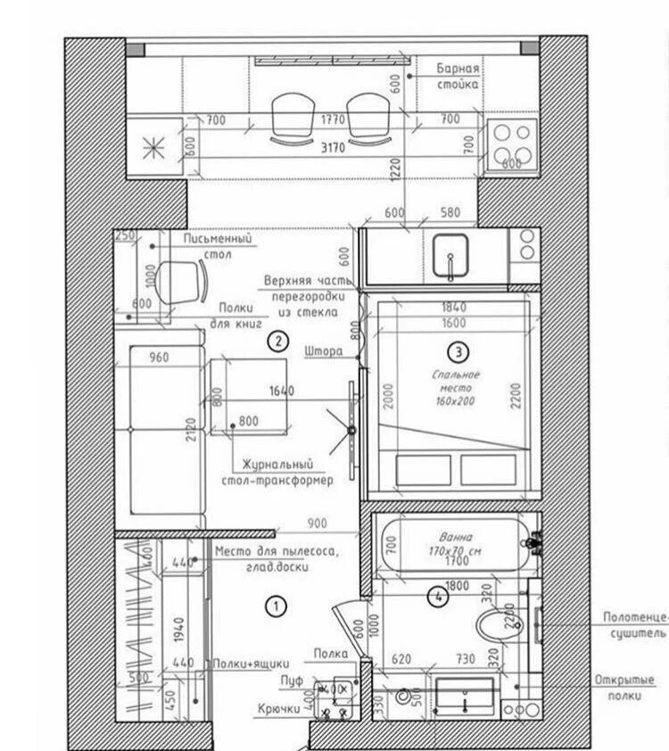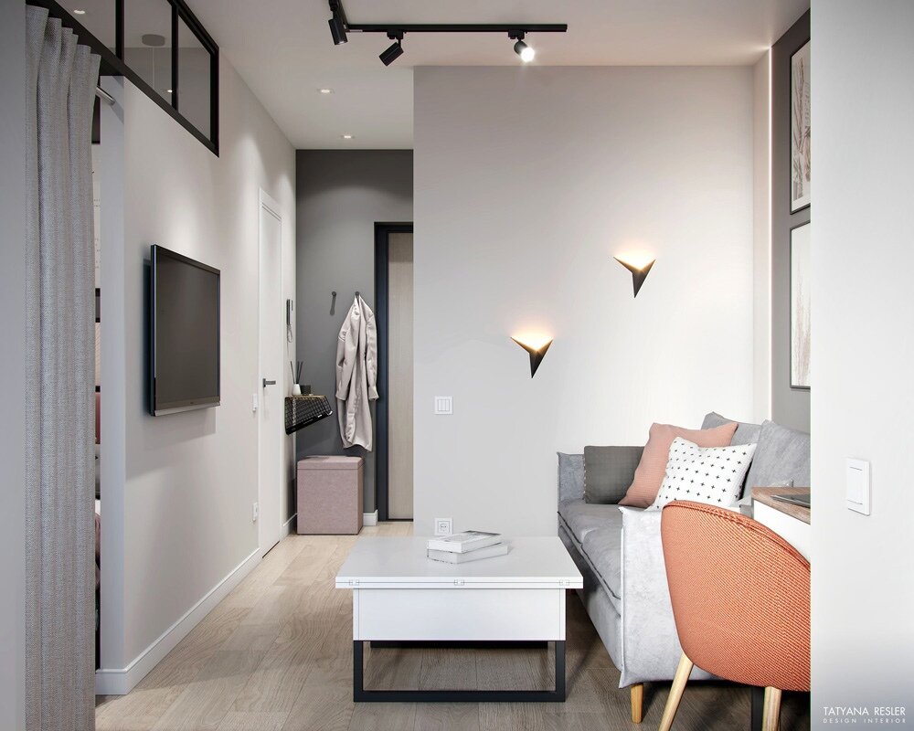 Площадь 29,6 кв.м (кухня-гостиная 16,6 кв.м, спальня и санузел по 4 кв.м, прихожая 5 кв.м).