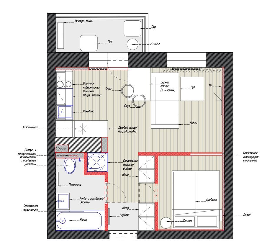 Проект перепланировки однокомнатной квартиры в открытое пространство.