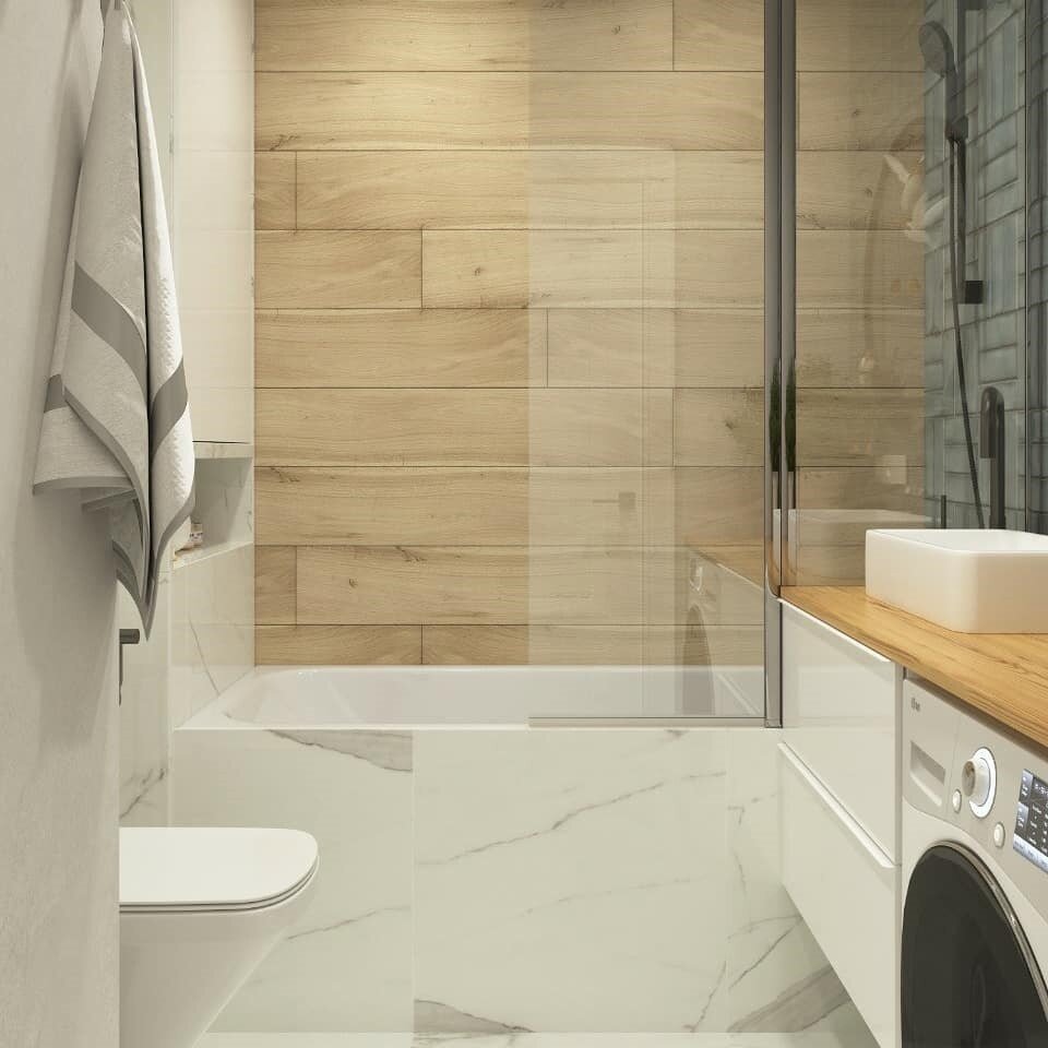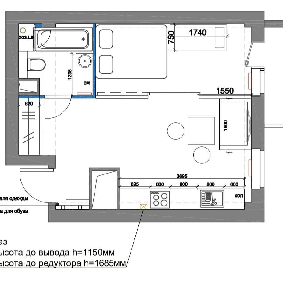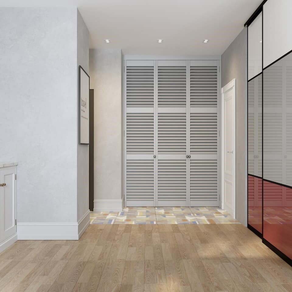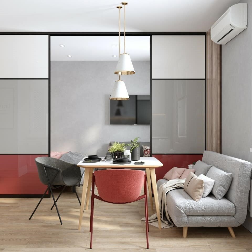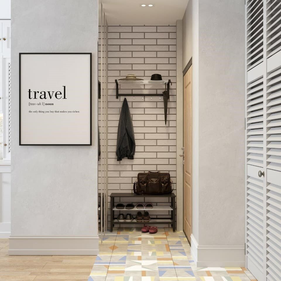 Между комнатой и прихожей нет стены, это позволило максимально увеличить пространство, где разместили кухню-гостиную.
