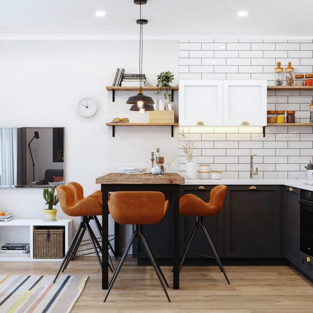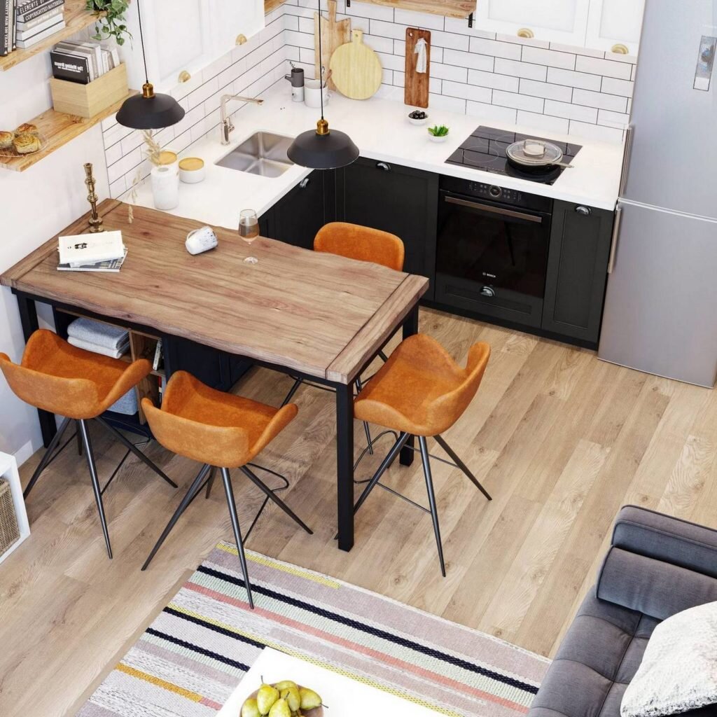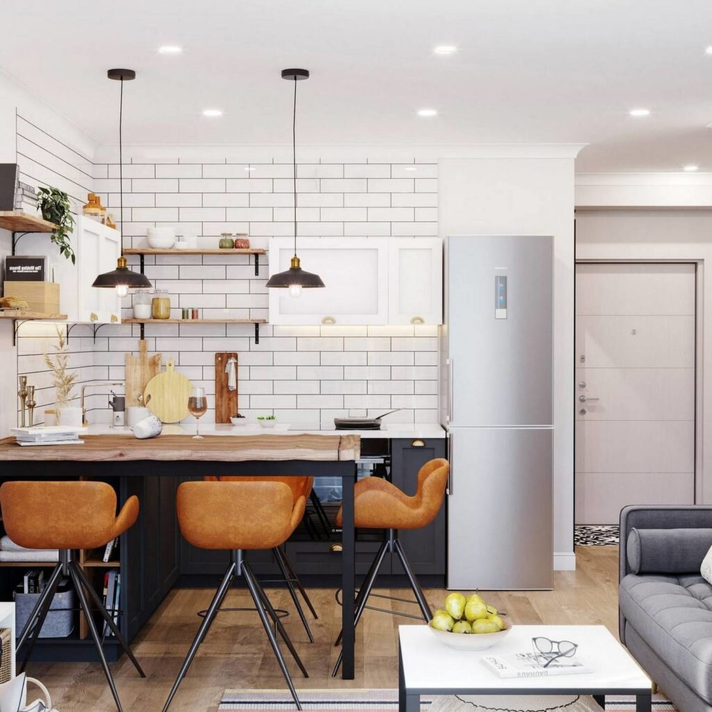 Как видите, кухня объединена с мини-гостиной, что также очень распространенное решение для скандинавского стиля.