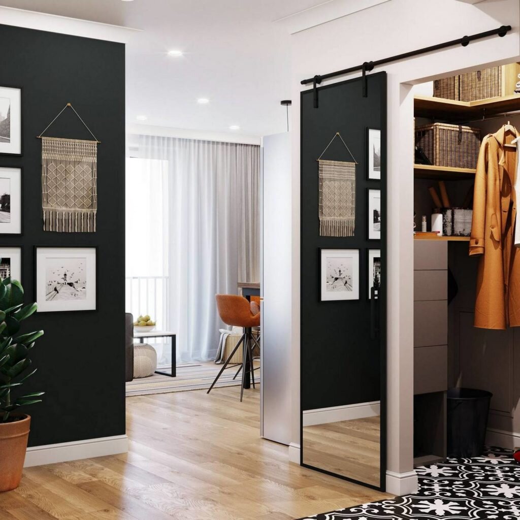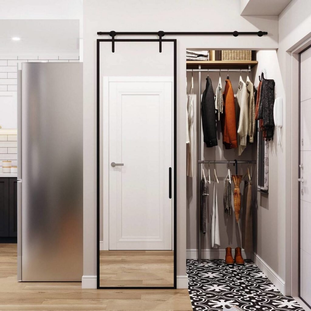 Очень удачное решение в прихожей — раздвижное зеркало, оборудованное накладным рельсовым механизмом, которое экономит место, практично и эффектно заменяет дверцу гардероба.