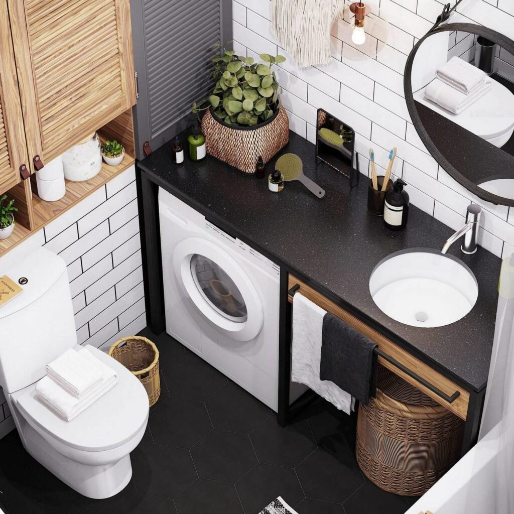 С этой поверхностью идеально сочетаются всевозможные аксессуары, фурнитура черного цвета не только в кухне, но и ванной.