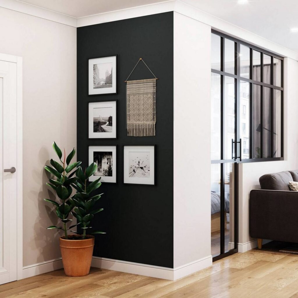Черный цвет в виде акцентной стены делает спокойный светлый интерьер прихожей более выразительным и живым, а также придает ему неповторимый характер.