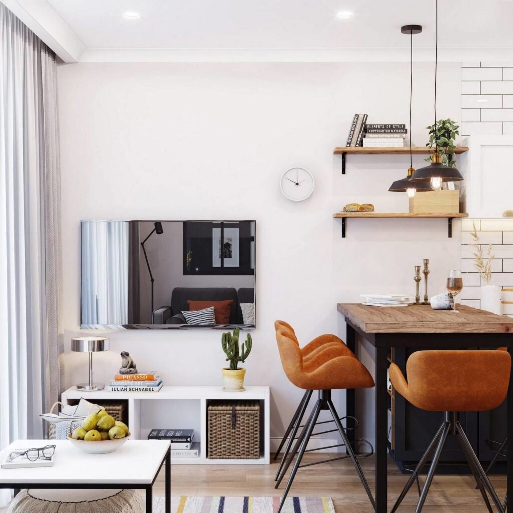 Обеденная зона очень выразительна благодаря брутальному столу и оригинальным барным стульям терракотового цвета.