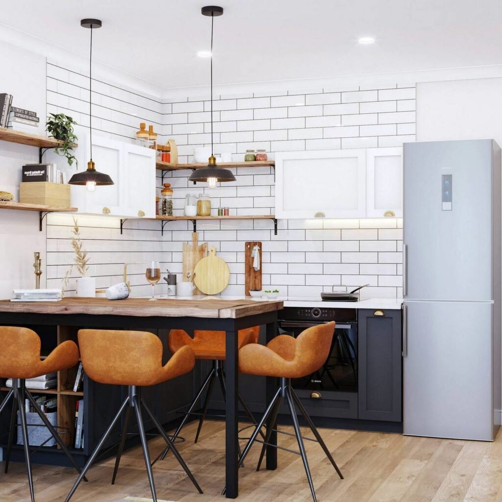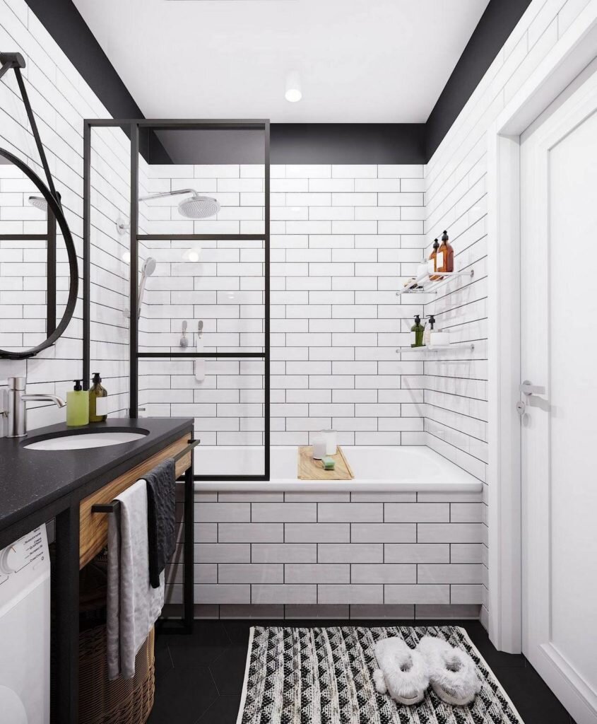 Черные аксессуары всегда отлично выделяются на фоне нейтрального белого, но важно не переборщить с их количеством, которое может захламить интерьер, который должен быть в первую очередь светлым и чистым.Популярным решением в скандинавском стиле является использование простой белой облицовочной плитки метро в качестве декоративного элемента.