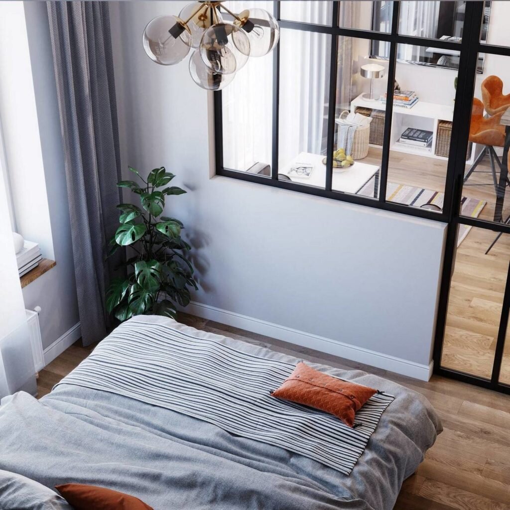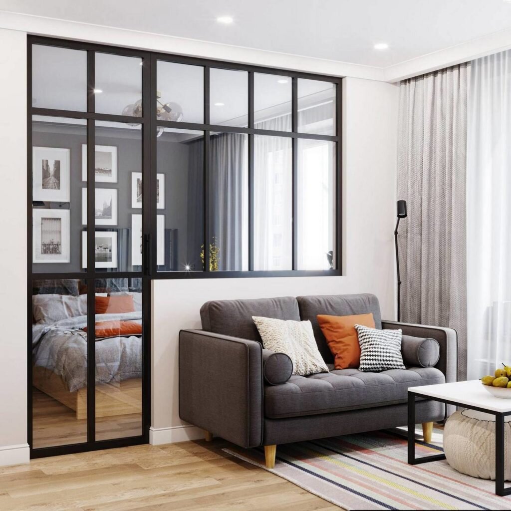 Спальня почти полностью отделена от гостиной застекленной перегородкой с металлическим каркасом, так что в нижней части стены можно разместить небольшой диван.Стеклянные поверхности с черным профилем отлично дополняют не только интерьер спальни, но и зоны мини- гостиной.