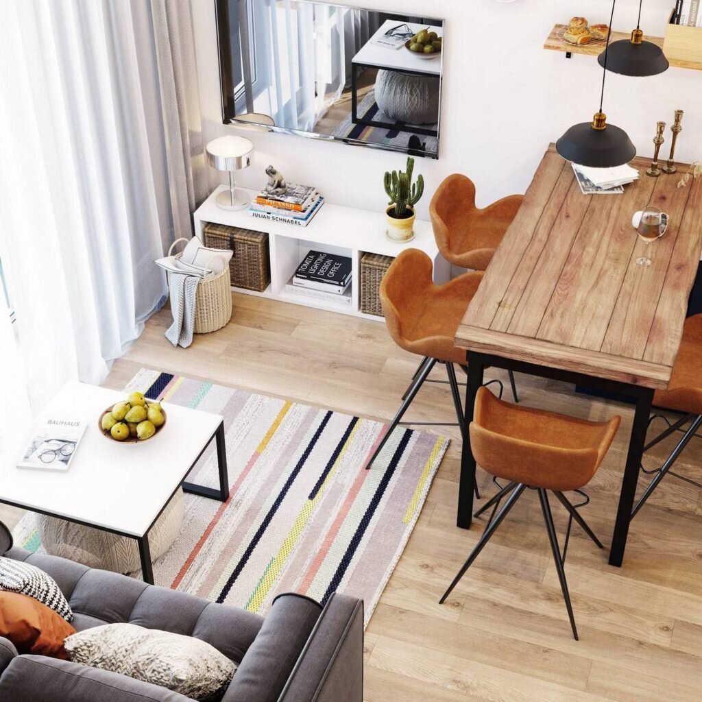Простота — одно из главных посылов скандинавского стиля, и такое сочетание цветов помогает добиться этого эффекта.Прекрасным примером типично скандинавского оформления гостиной служат деревянные ножки дивана, простой коврик, журнальный столик с черным стальным основанием, плетенные корзины, вязанный пуф и открытая консоль, в которой можно хранить всякую всячину.
