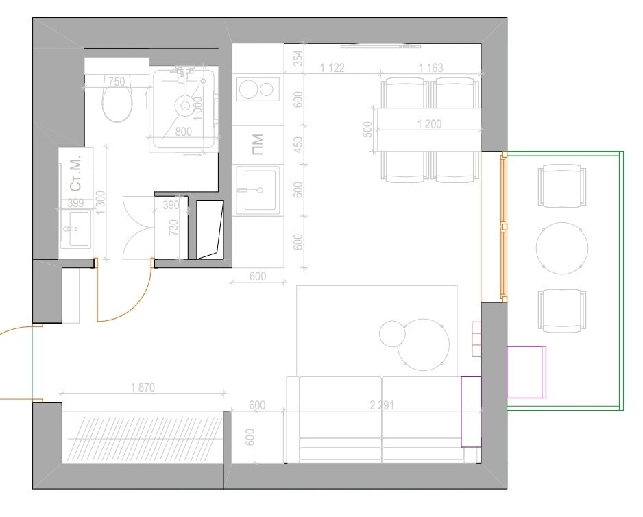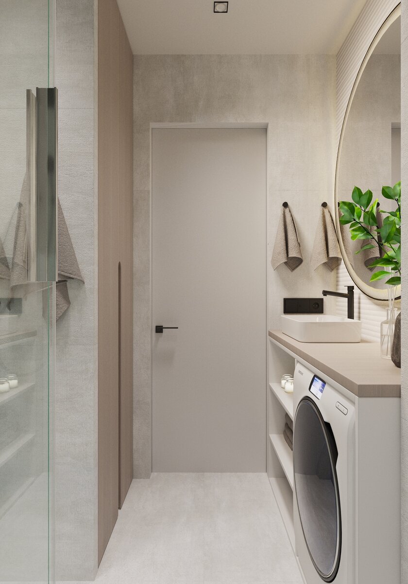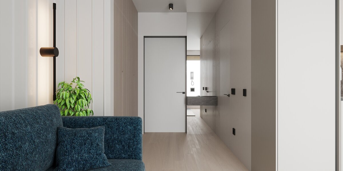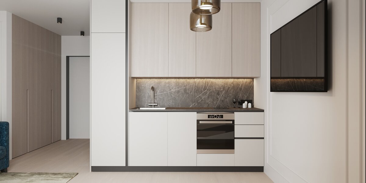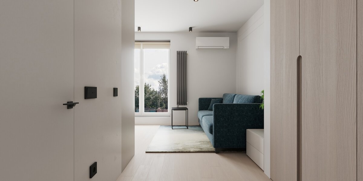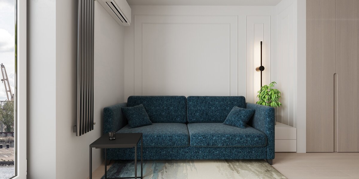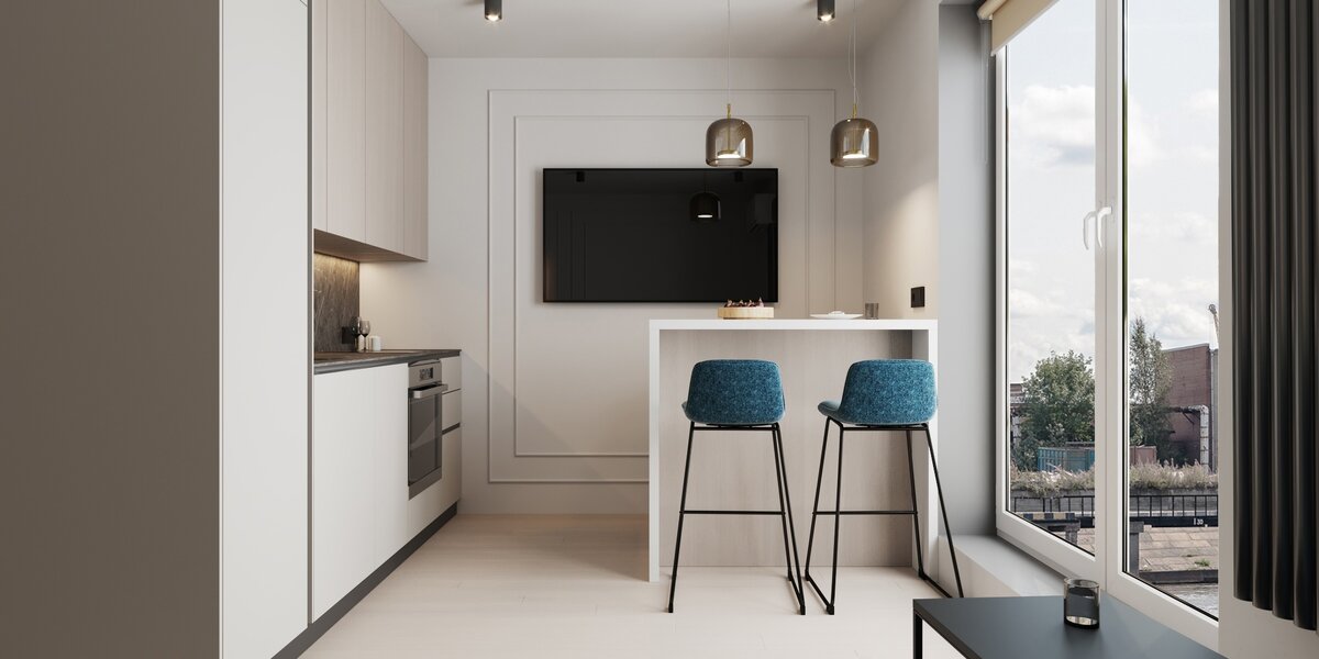 Площадь 23 кв.м. Интерьер в стиле минимализм. Светлая мебель в цвет стен и панорамное окно — отличное решение для визуального расширения пространства.