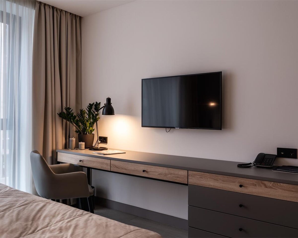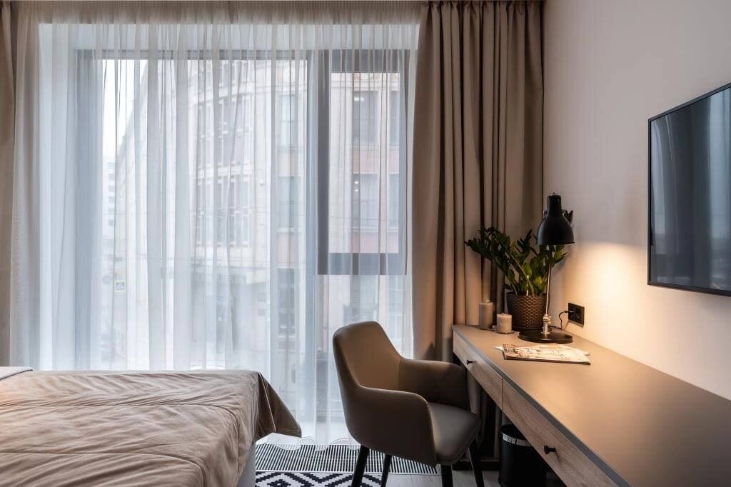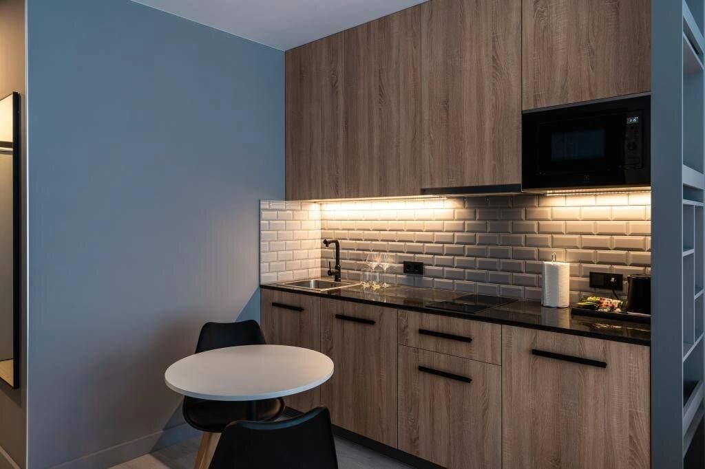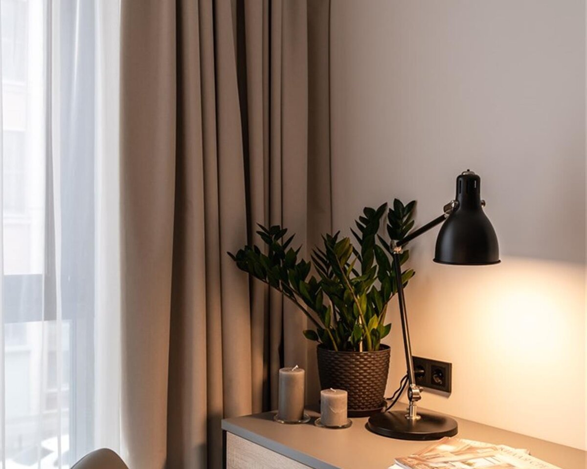 Простое, но со вкусом оформленное теплых оттенках серого и бежевого в сочетании с деревянными элементами пространство— идеальное решение для студии под аренду.