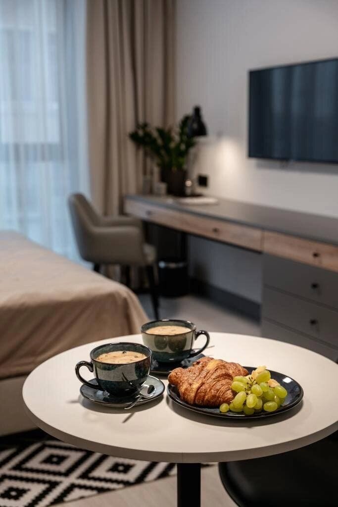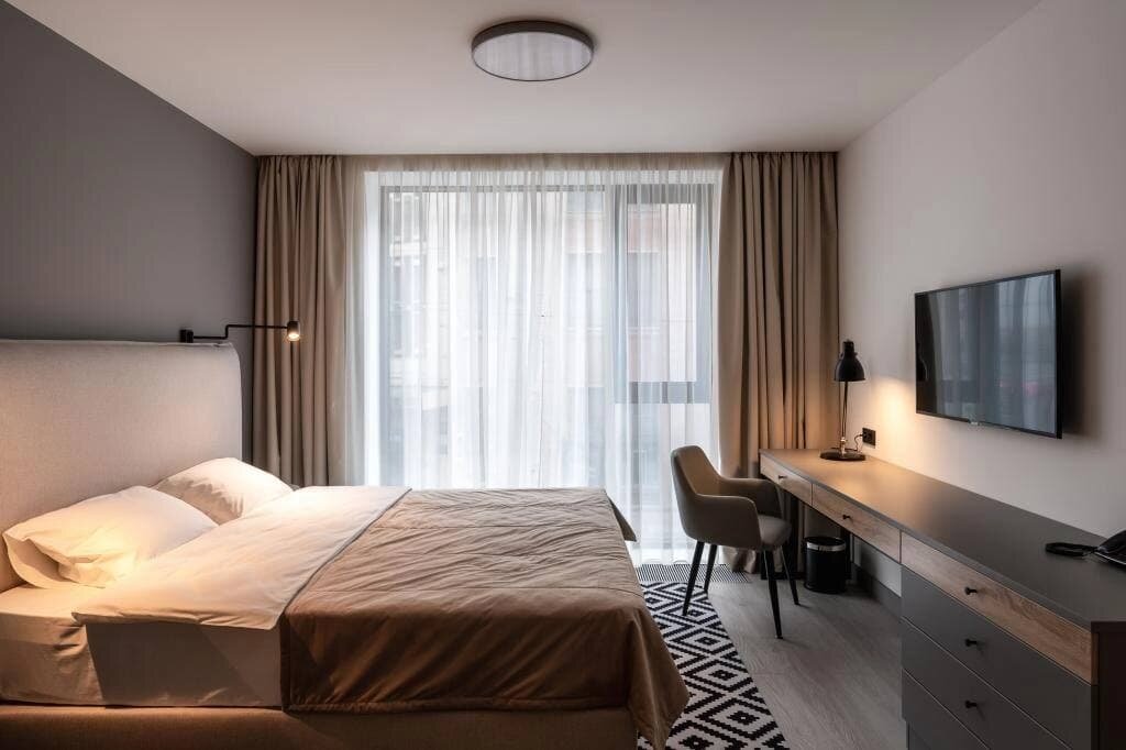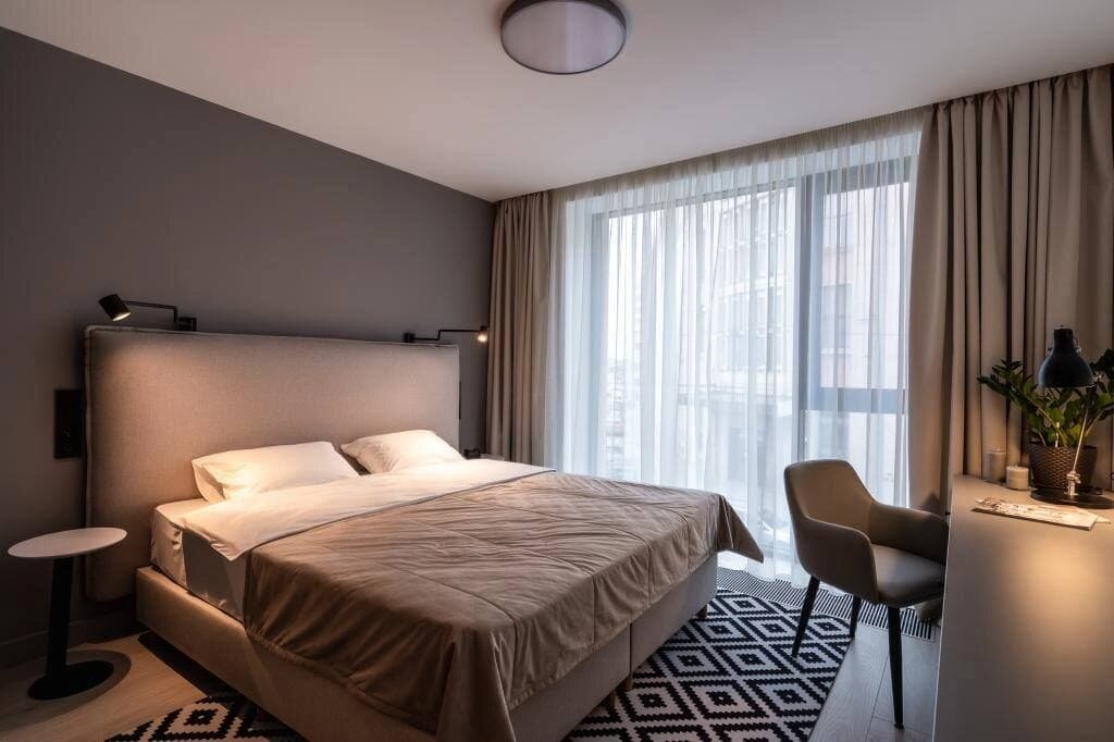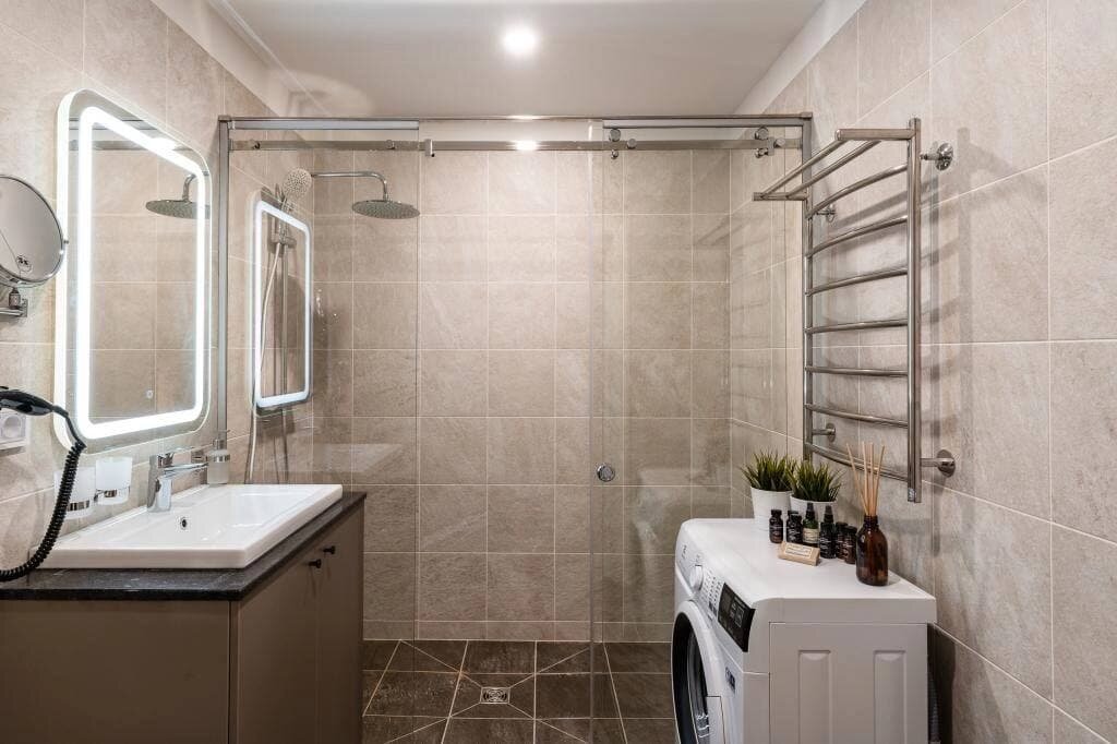 Простое, но со вкусом оформленное теплых оттенках серого и бежевого в сочетании с деревянными элементами пространство— идеальное решение для студии под аренду.