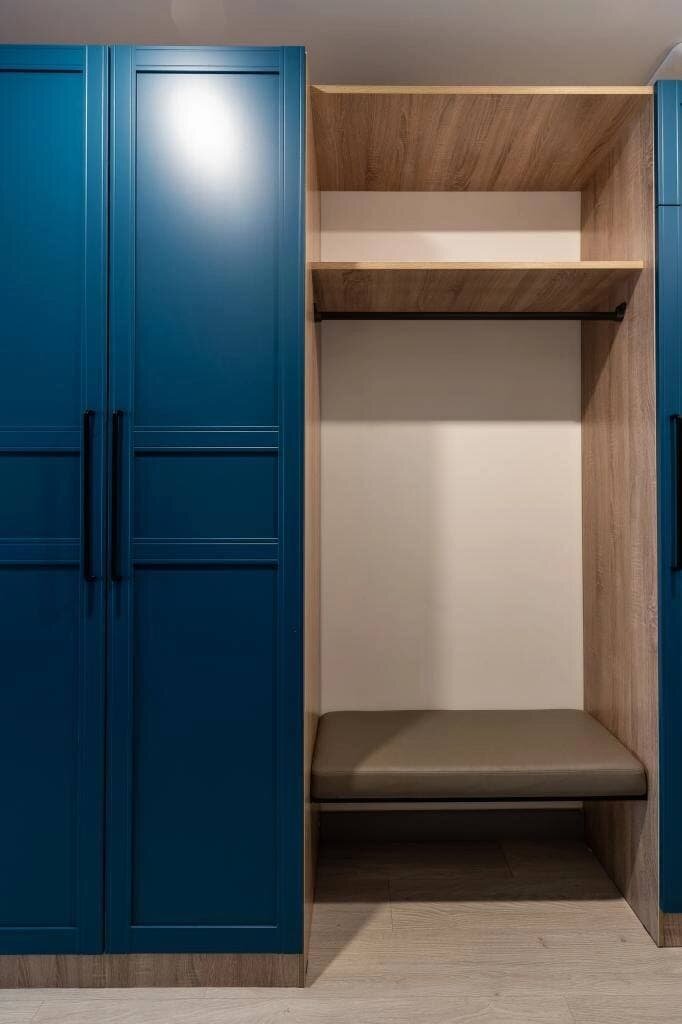 Синий цвет здесь появляется в небольшом количестве: в прихожей, кухне. Однако, все цвета хорошо сбалансированы.