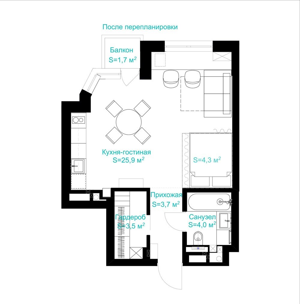 Хозяева отказались от изолированной кухни или спальни, выбрав открытую планировку.