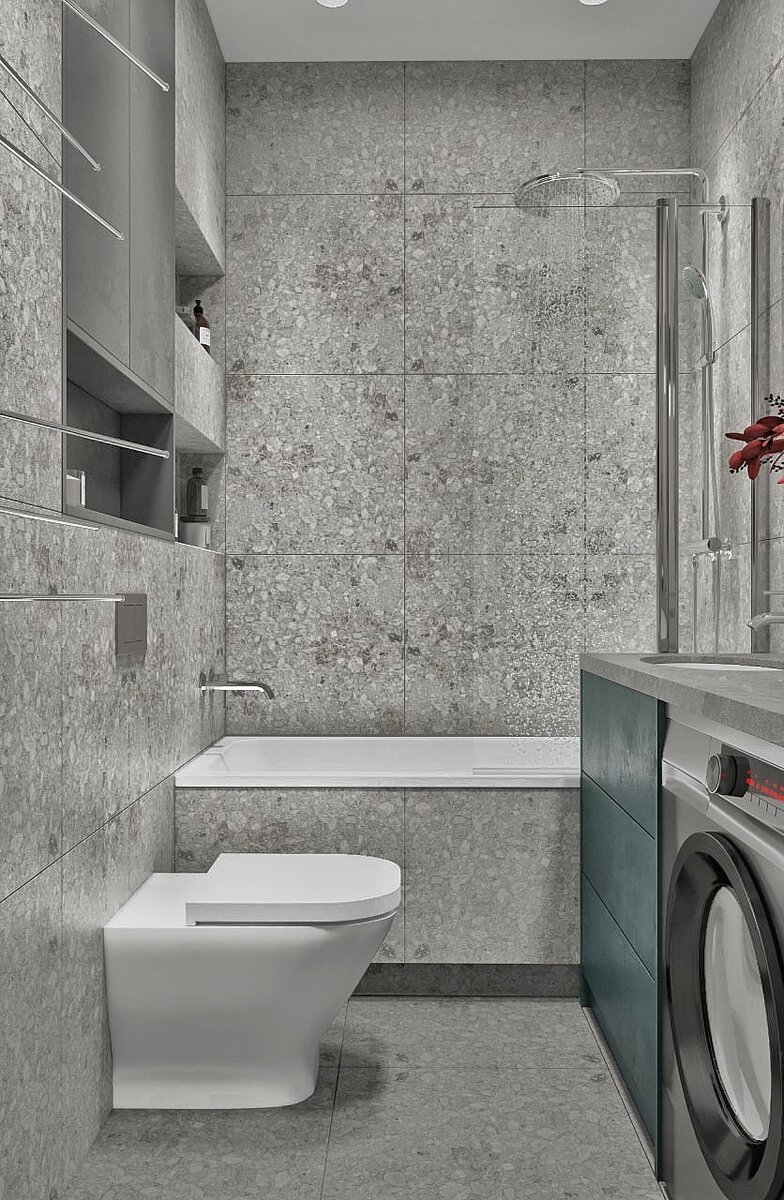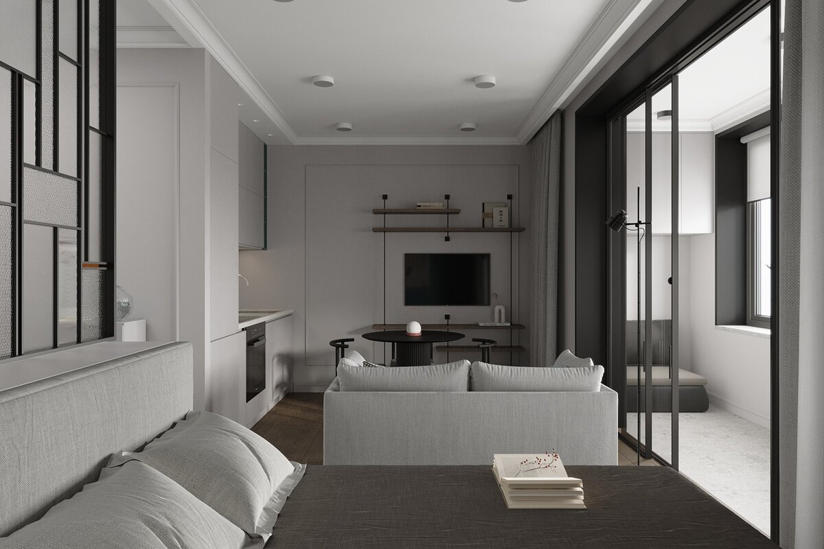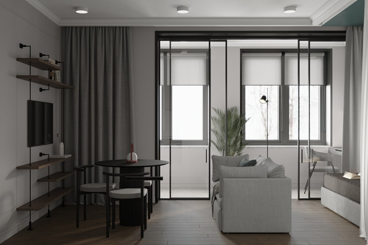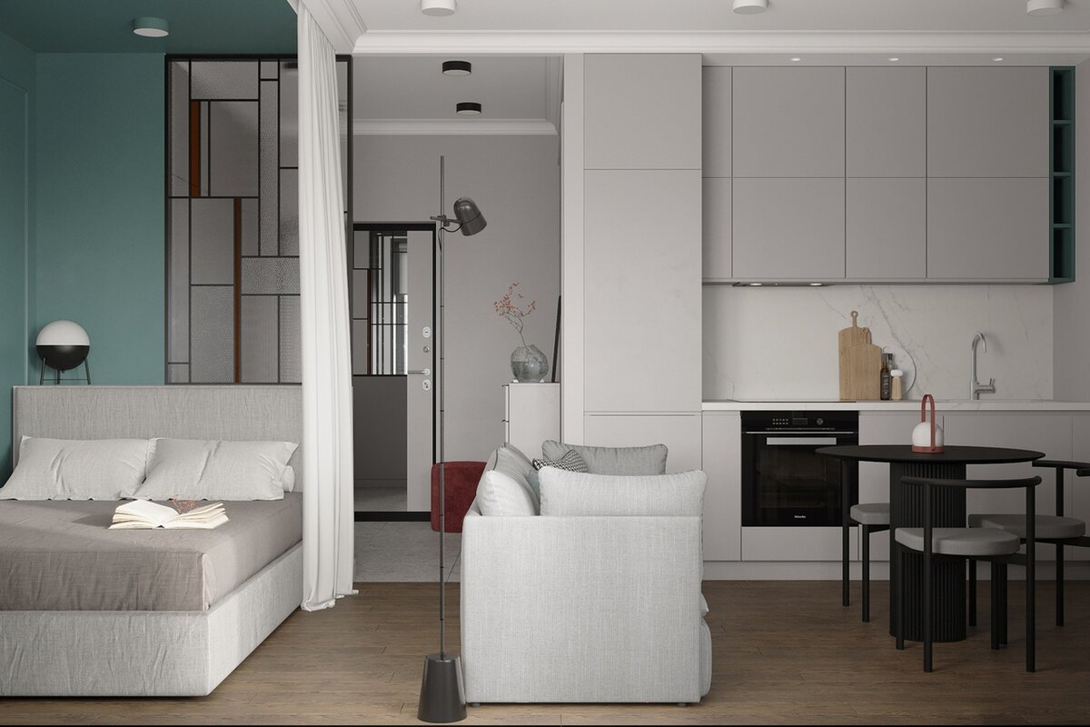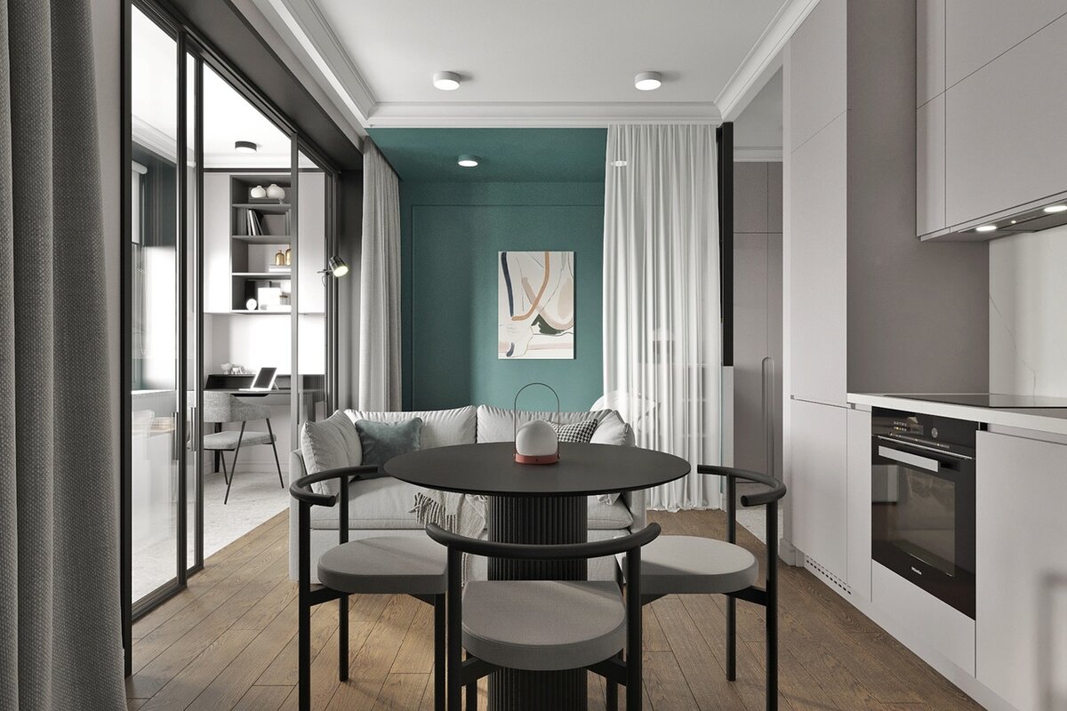 В качестве акцентов выступают благородный мятный и темное дерево, которые поддерживают темные металлические элементы.
