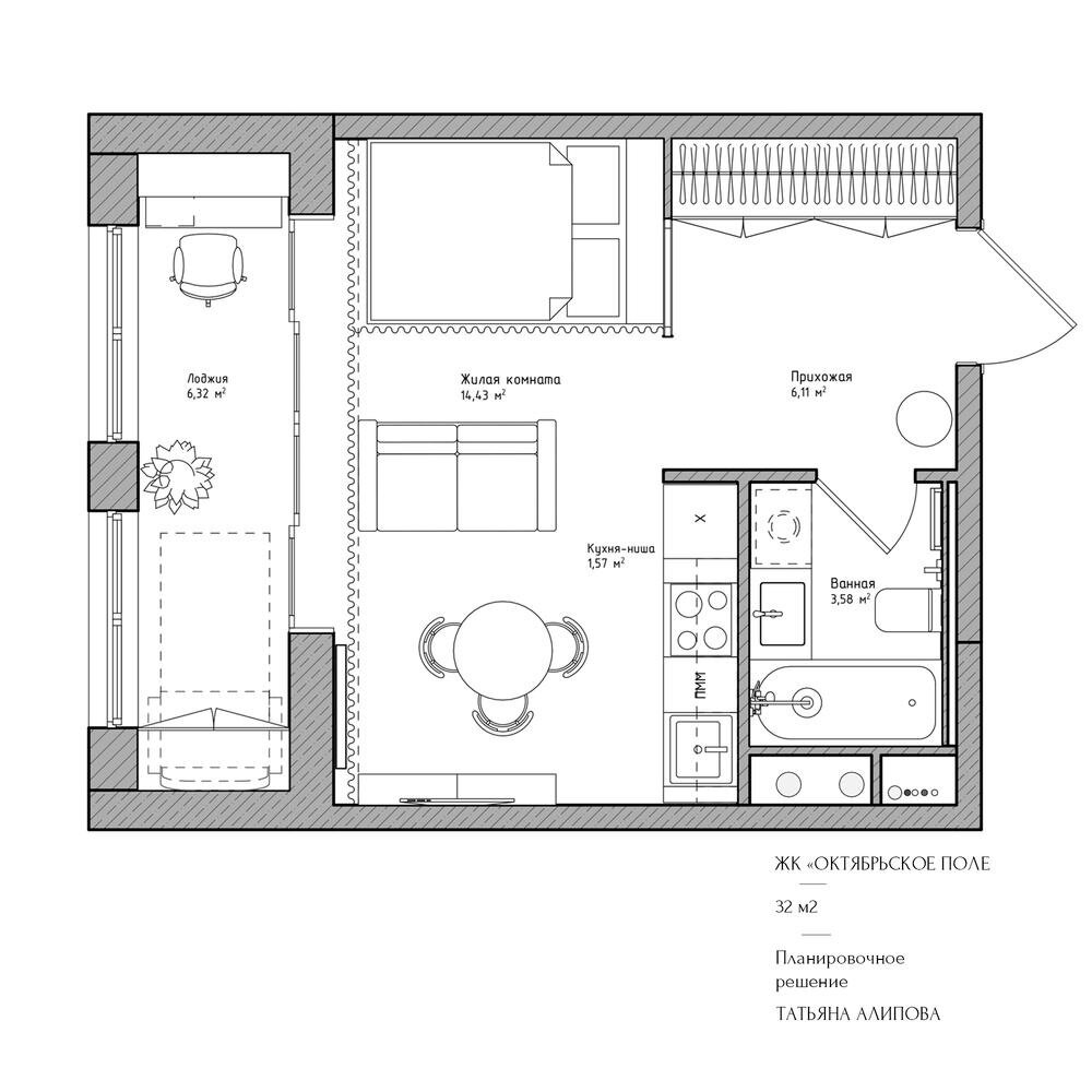 Площадь 28,7 кв.м. (+ теплая лоджия 6,3 кв.м.).