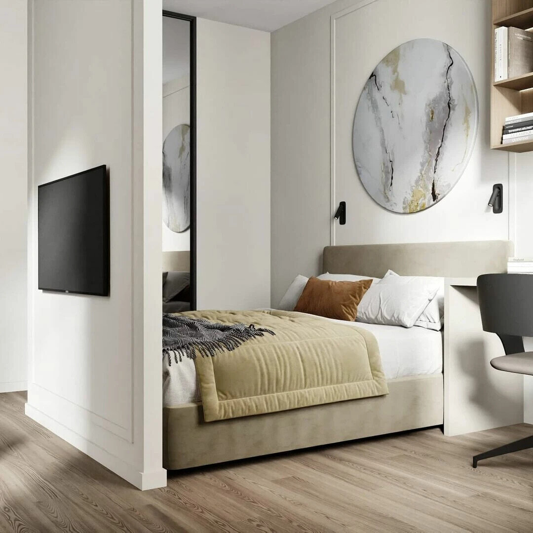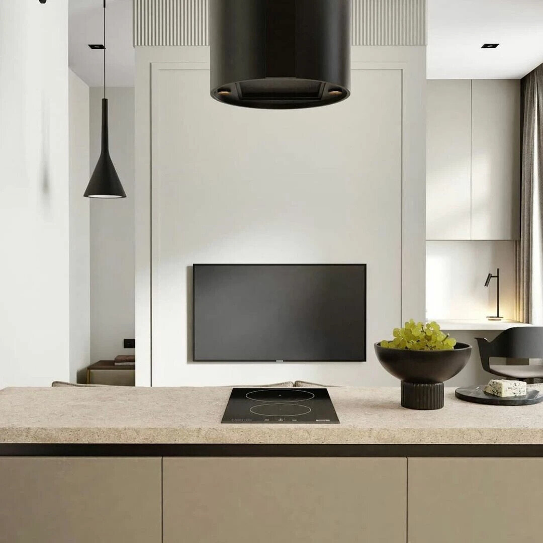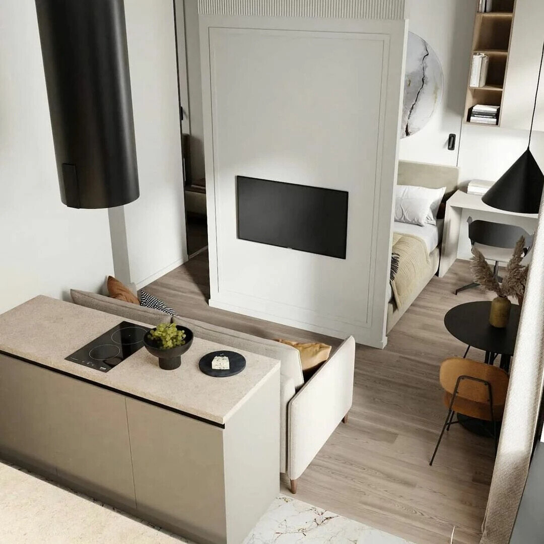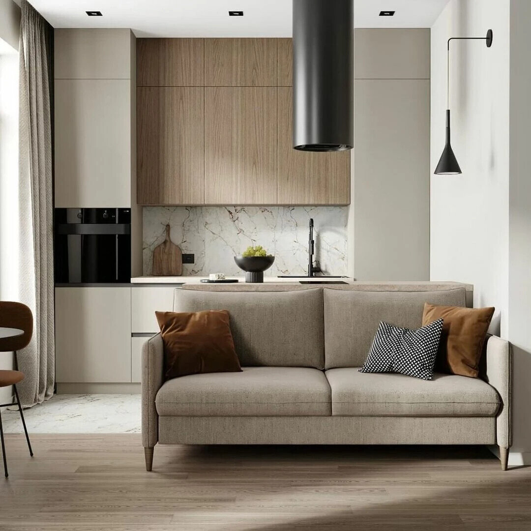 - Изысканные детали и золотые акценты. Элегантная кухня-гостиная в молочно-кремовых тонах
