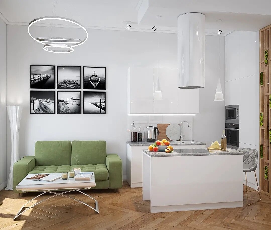 Бывшую однушку полностью преобразили — кухню отодвинули ближе к прихожей, за счет этого появилось место для мини-гостиной у окна.