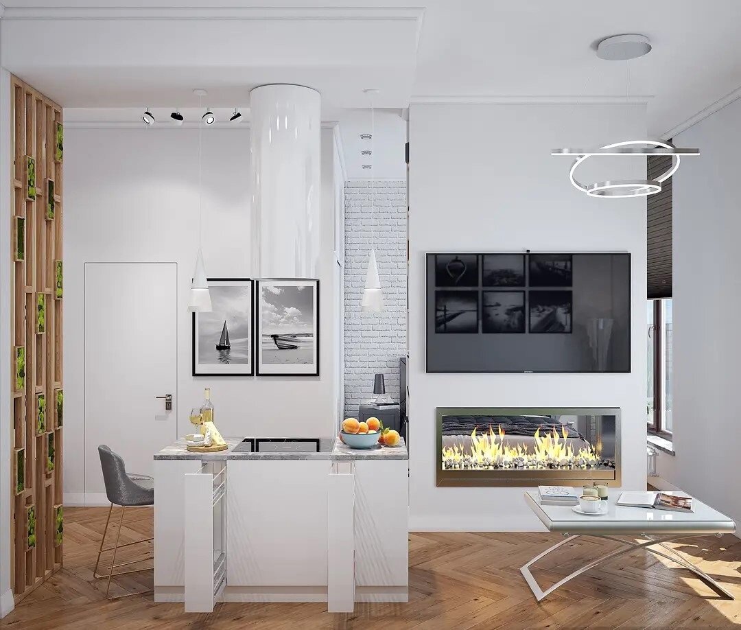 Спальню отделили перегородкой со встроенным двусторонним биокамином.
