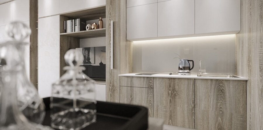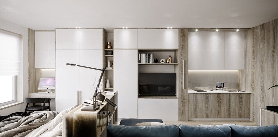 - Изысканные детали и золотые акценты. Элегантная кухня-гостиная в молочно-кремовых тонах