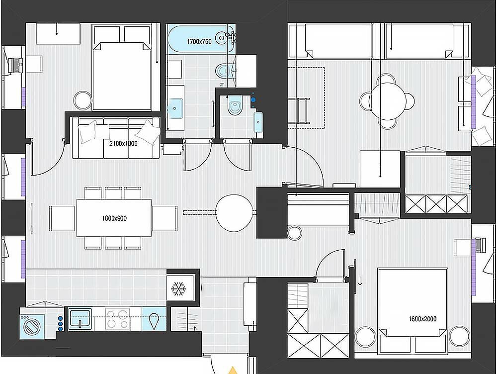Так как расчет был в первую очередь сделан на семьи с детьми, с большим количеством спальных мест и мест для хранения, дизайнеру пришлось искать оптимальные решения для перепланировки.