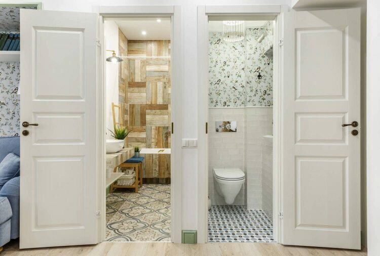 Чтобы максимально использовать пространство маленькой ванной комнаты, межкомнатные двери были спроектированы так, чтобы открываться наружу.