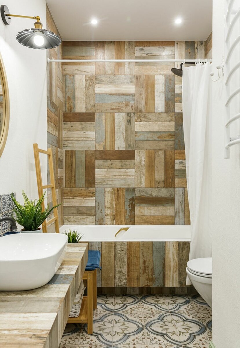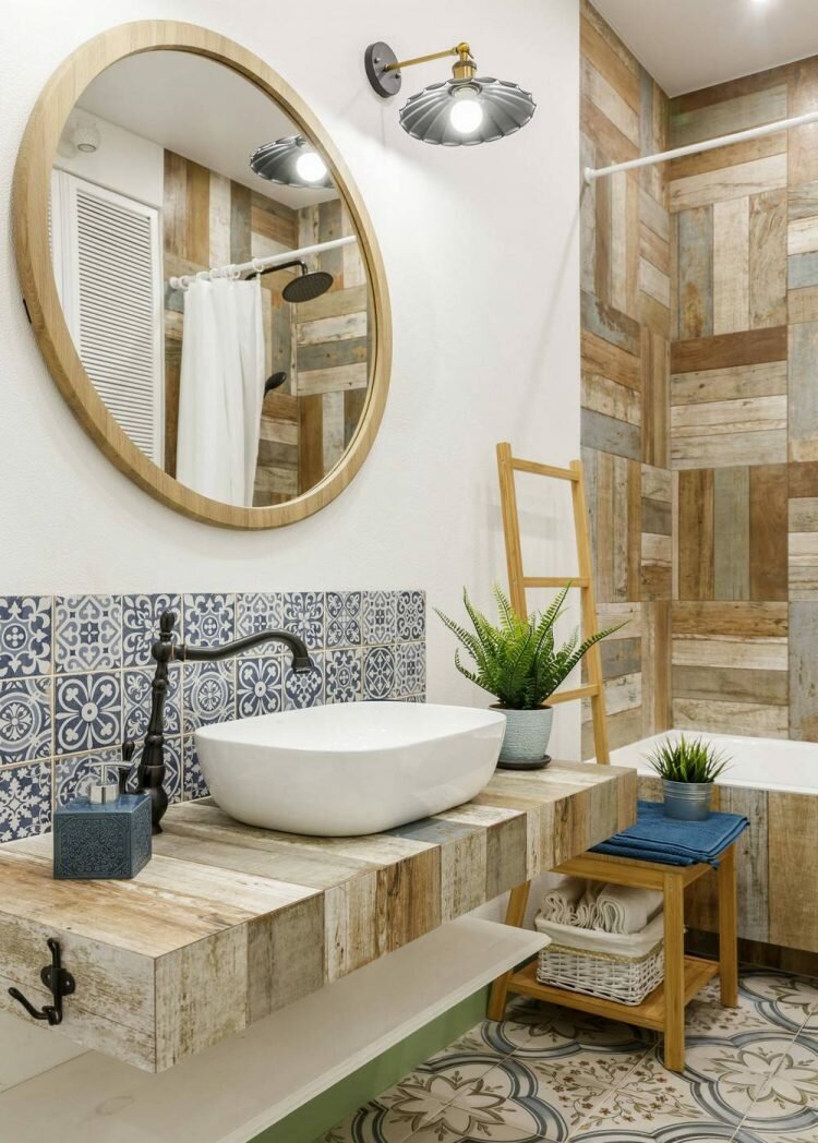 В ванной комнате минимум мебели, а керамическая плитка уложена только в местах, чувствительных к влаге, поэтому ванная не выглядит перегруженной и тесной.