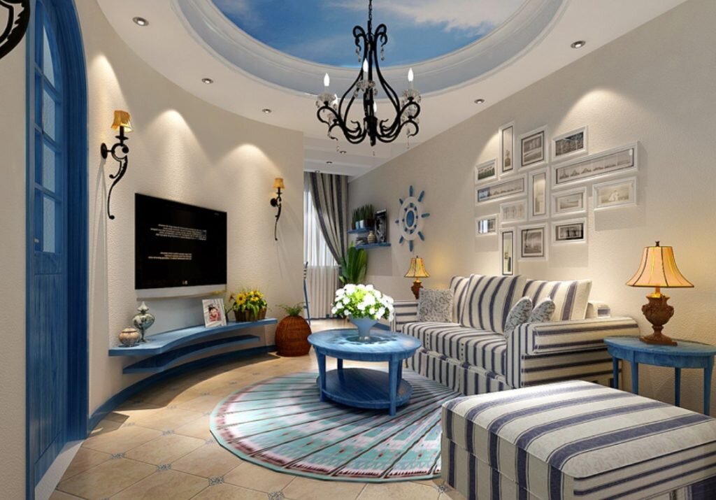 Синий во всех оттенках, белый и бирюзовый являются основными цветами для украшения вашей гостиной, если вы хотите создать атмосферу беззаботного летнего дня.