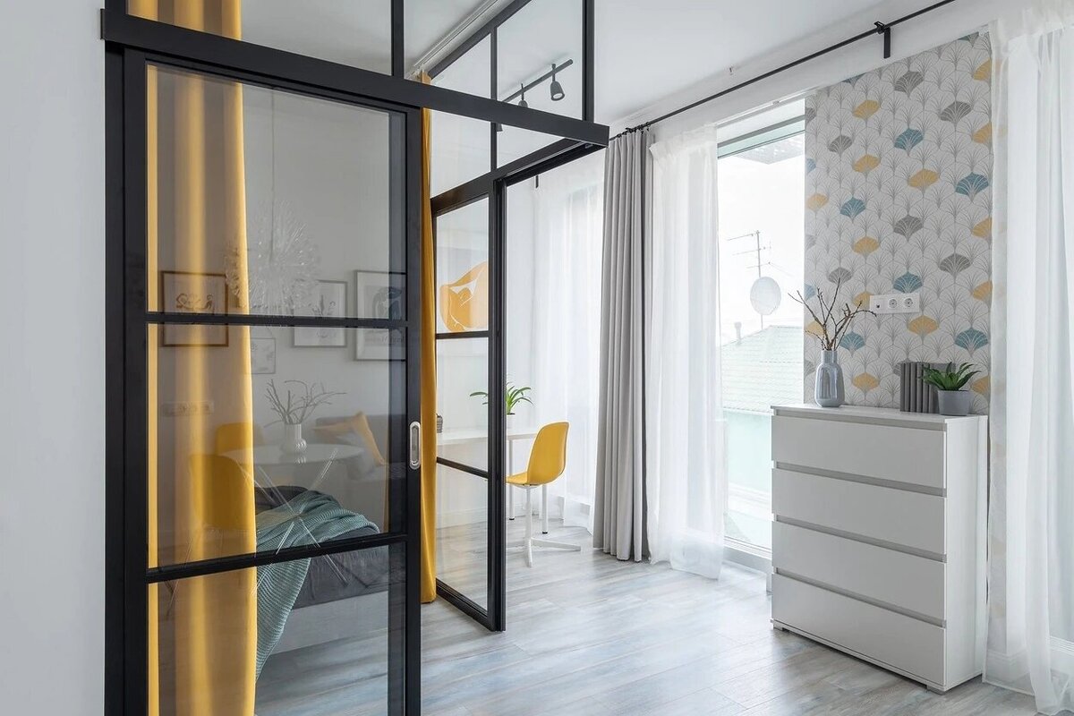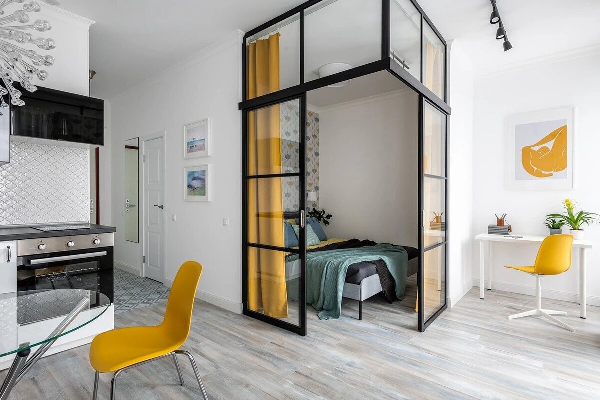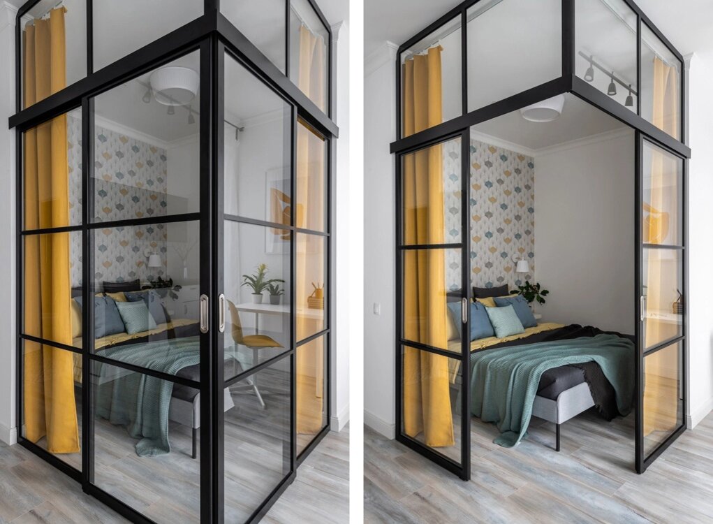 Спальная зона отгорожена стеклянными перегородками с плотными шторами.